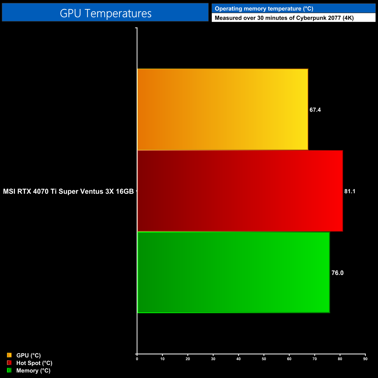 For our temperature testing, we measure the peak GPU core temperature under load. A reading under load comes from running Cyberpunk 2077 for 30 minutes.
