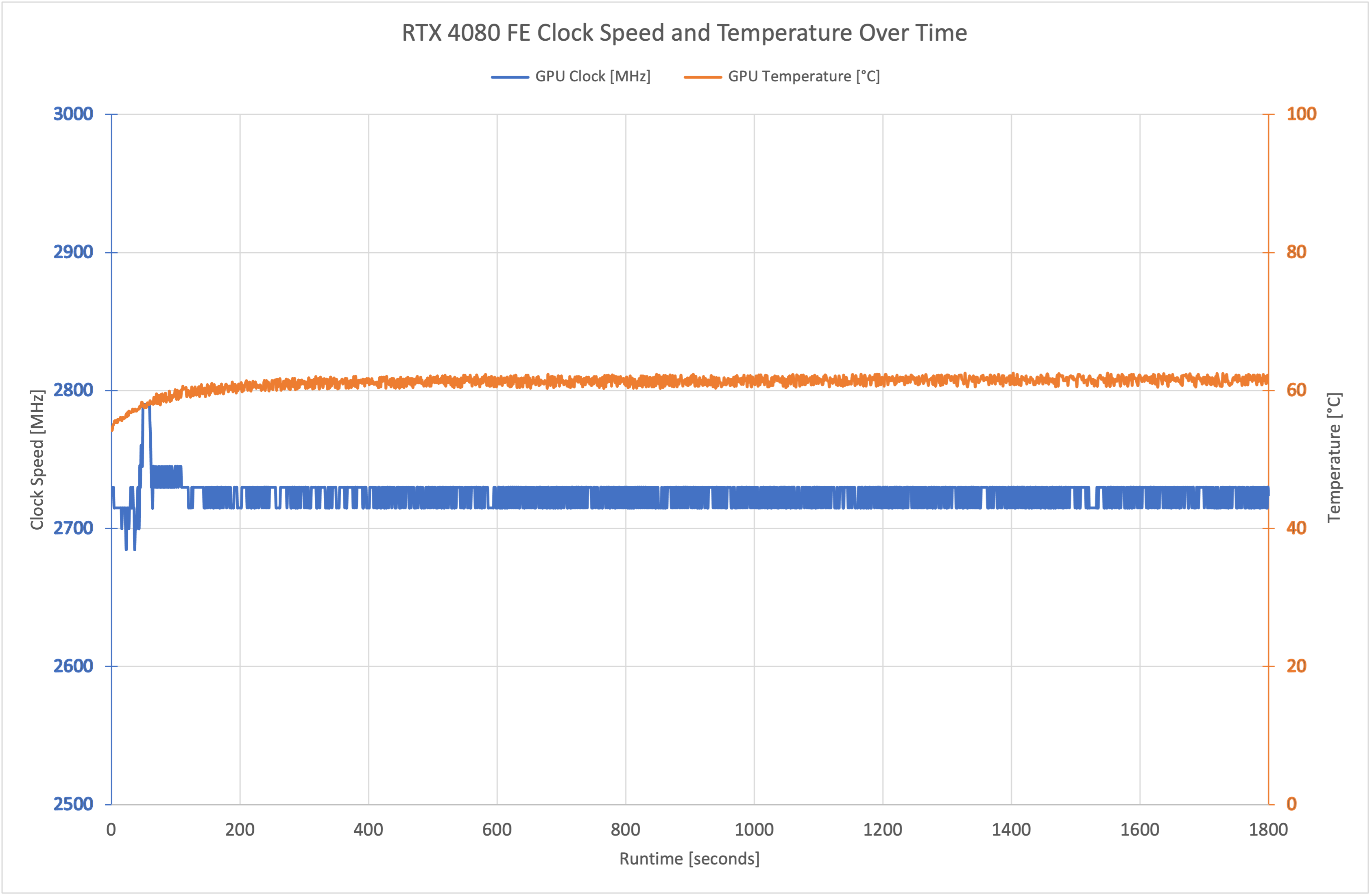 Operating clock speed is always an interesting area to assess. Behaviour is very similar to the RTX 4090 here, with the RTX 4080 initially boosting up to 2790MHz at the start of our 30-minute stress test, before settling down between 2715-2730MHz. Over the entire test it averages 2724MHz, so we will see how that compares to a range of partner cards in the coming days and weeks.