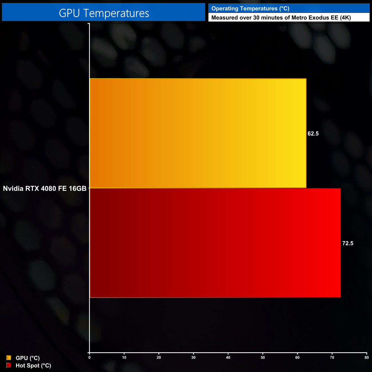 As we'd expect given Nvidia is re-using the RTX 4090 cooler on the RTX 4080, thermal performance of the Founders Edition is superb. The GPU peaked at 62.5C, with the hot spot running exactly 10C warmer. We also saw a peak of 70C for the GDDR6X memory, so we can have no complaints at all about the thermals here.