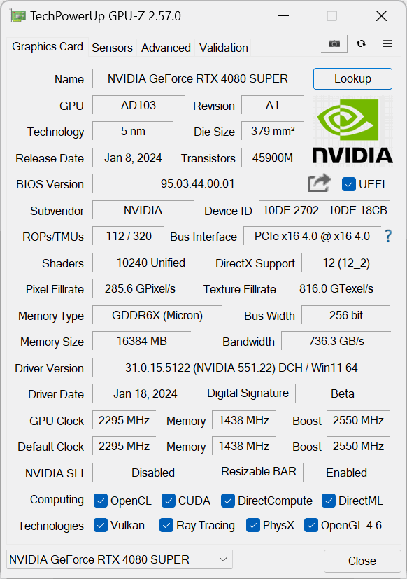 First, a quick spec recap. Unlike the RTX 4080 and RTX 4070 Ti which use cut-down versions of the AD103 GPU, the new 4080 Super is a full implementation of AD103 silicon, with the die measuring in at 379mm2. This means the RTX 4080 Super offers a total of 80 Streaming Multiprocessors (SMs), each housing 128 CUDA Cores, for a total of 10240. We also find 80 RT cores, 320 Tensor cores, 320 Texture Units, and 112 ROPs.