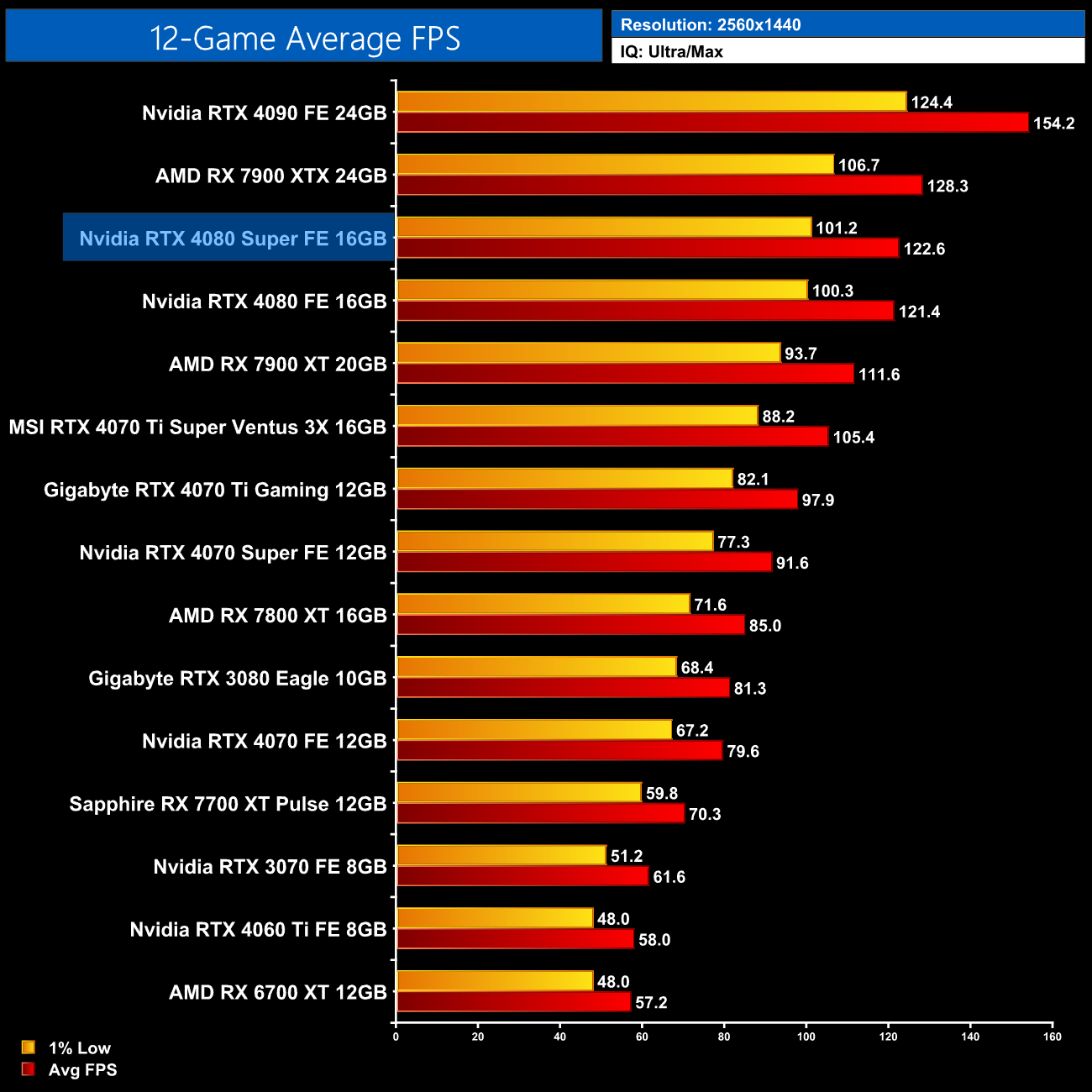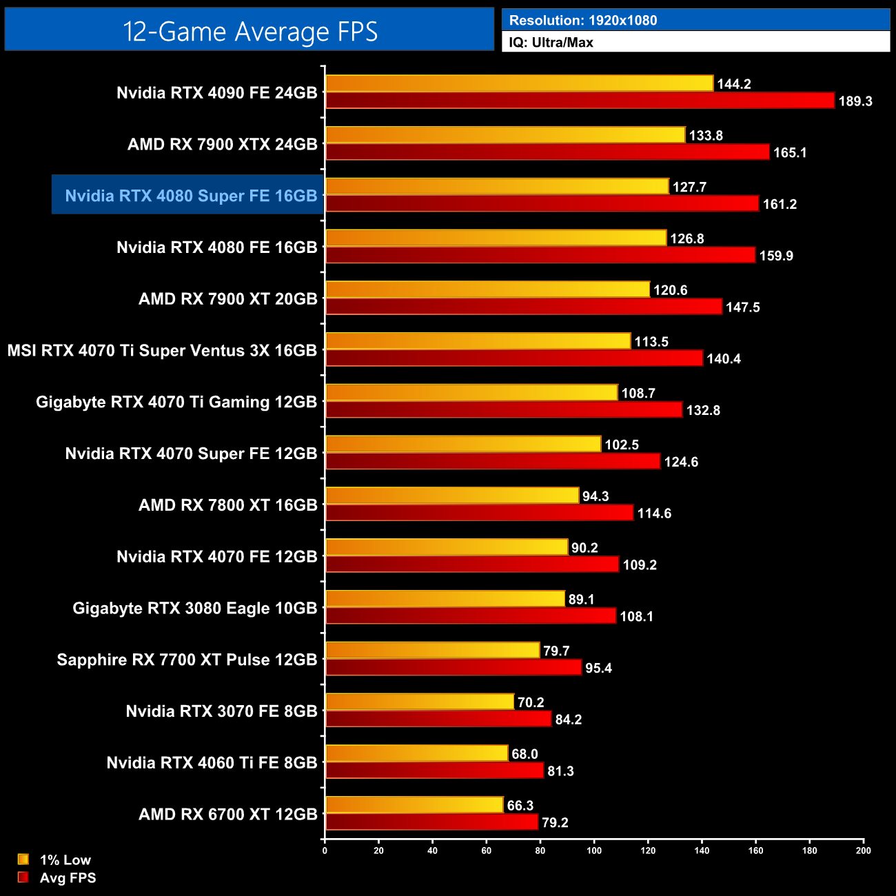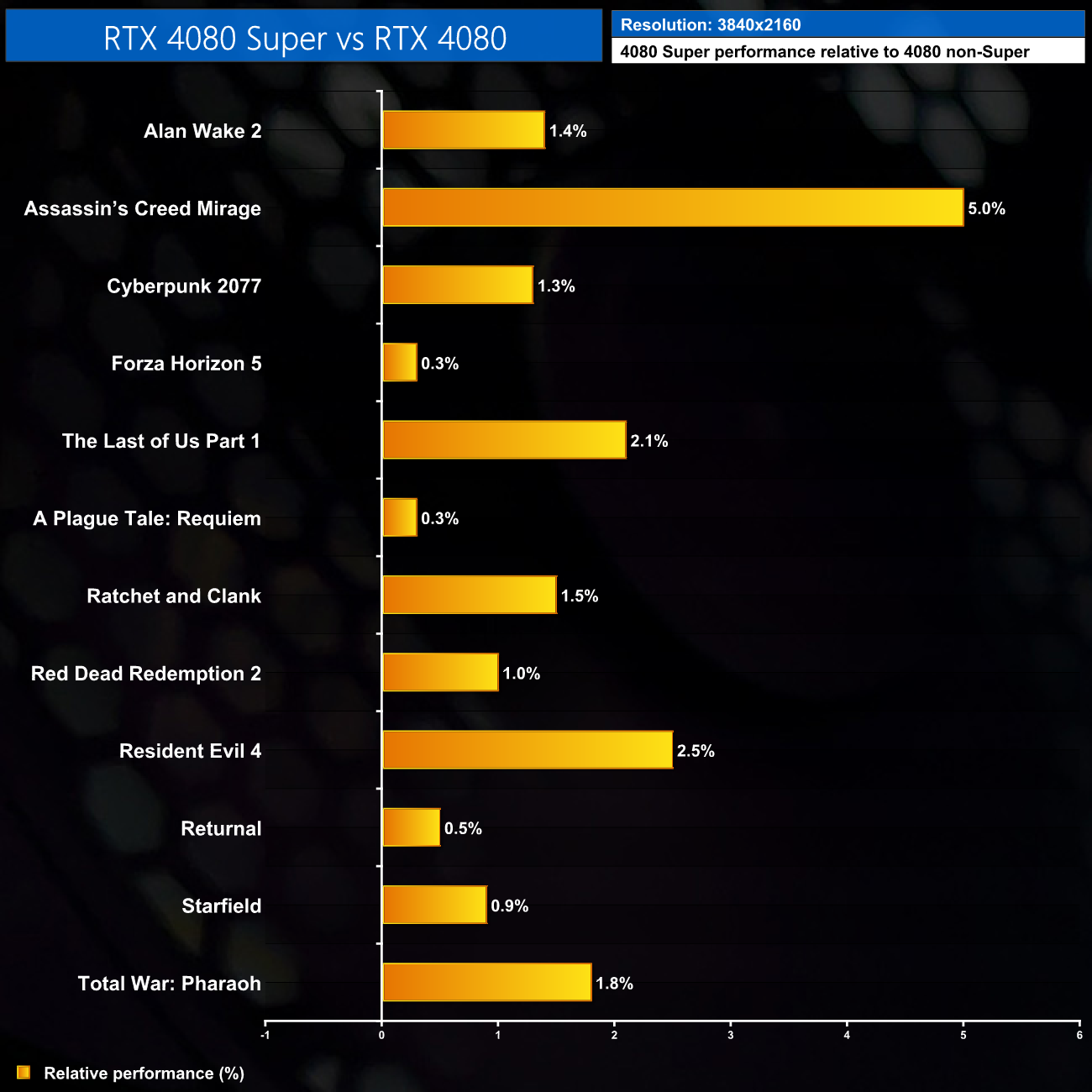 Just to illustrate the performance difference against the RTX 4080, above we have a breakdown of all 12 games tested at 4K, showing the relative performance increase of the 4080 Super. Just three titles show a difference of more than 2%, and only one shows a margin above 3%, so this really is margin of error stuff.