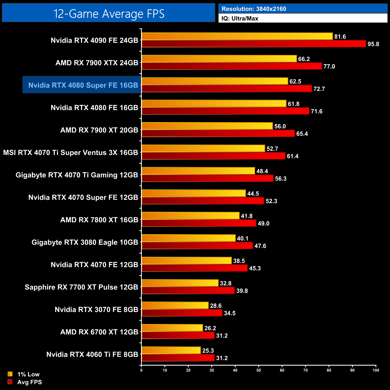 Overall then, it is safe to say, performance versus the RTX 4080 is very underwhelming. The price cut is clearly the main event here, but at 4K we're looking at an average difference that's just 1% in favour of the 4080 Super. That means the new GPU is still slower than the 7900 XTX by a 6% margin, while it's 11% faster than the 7900 XT and 18% faster than the 4070 Ti Super. Anyone hoping for anything close to RTX 4090 performance will be disappointed, as the 4080 Super is 24% slower on average at 4K.