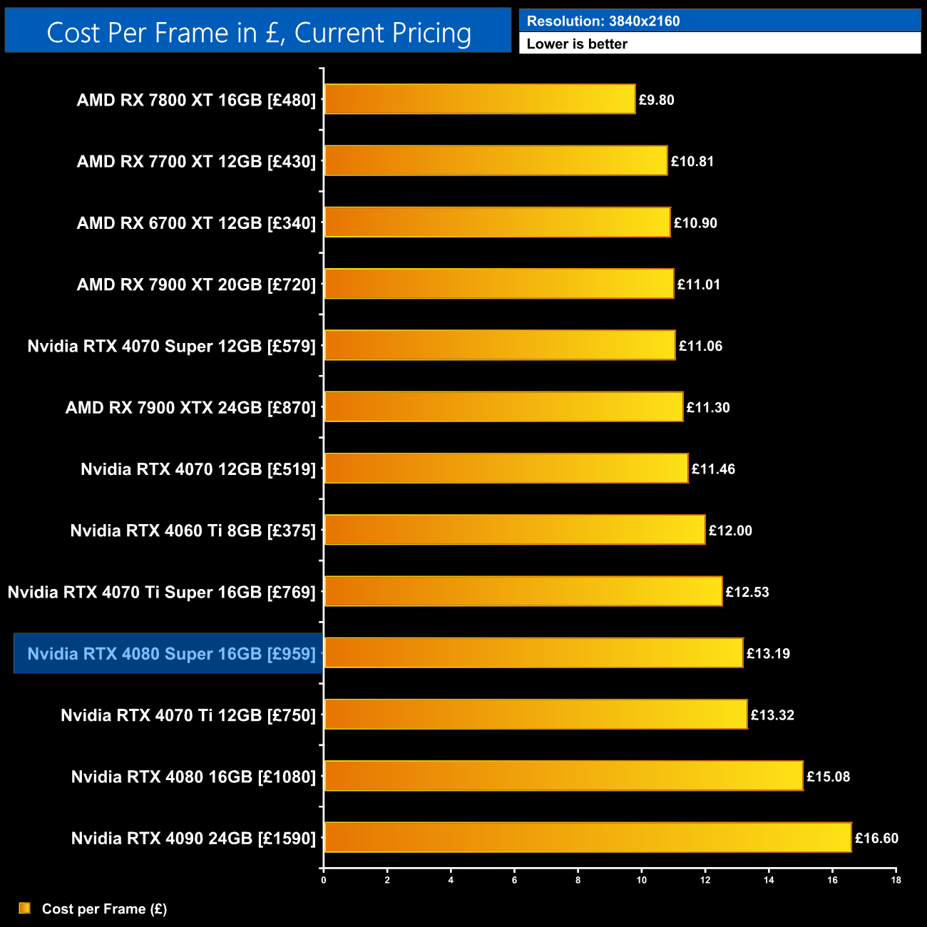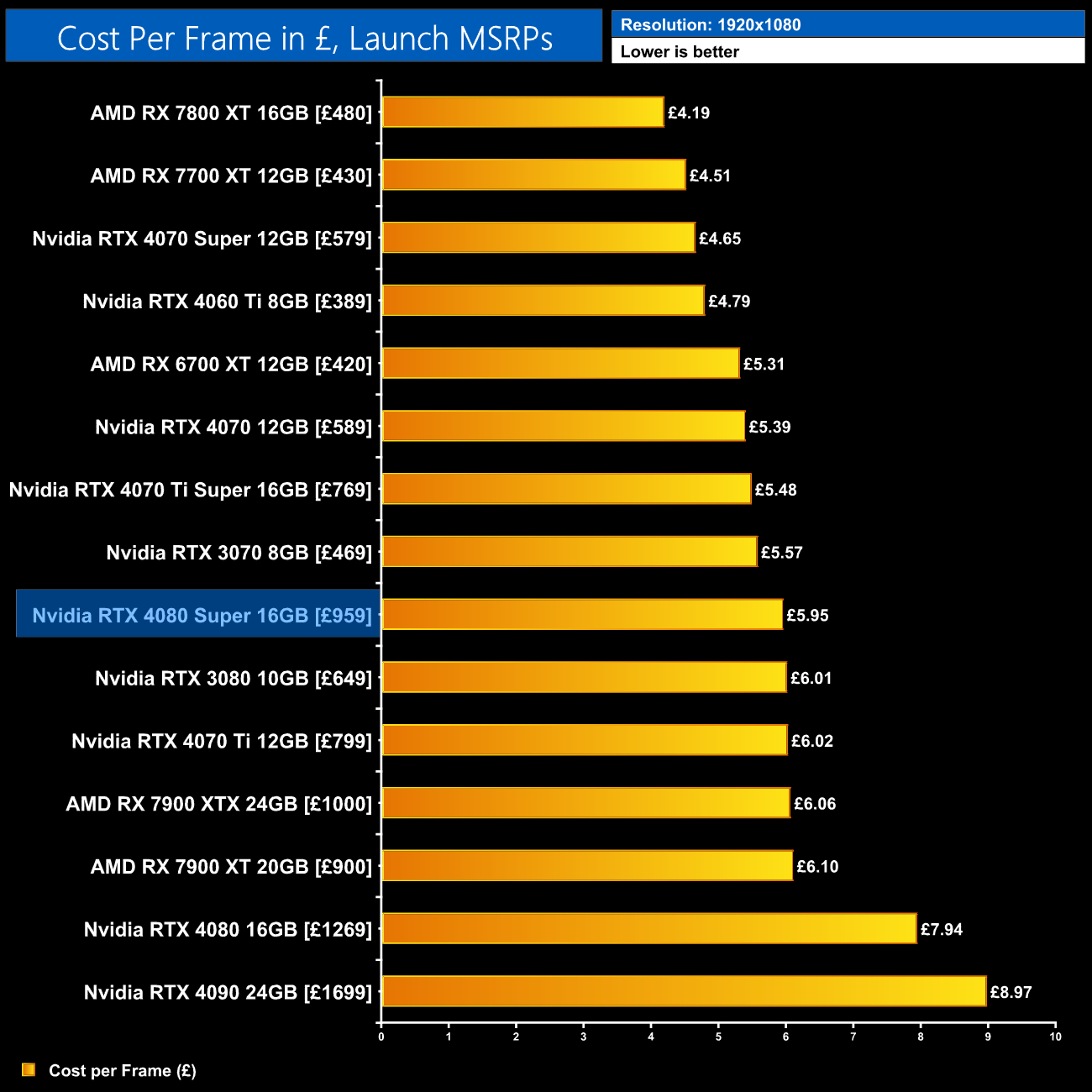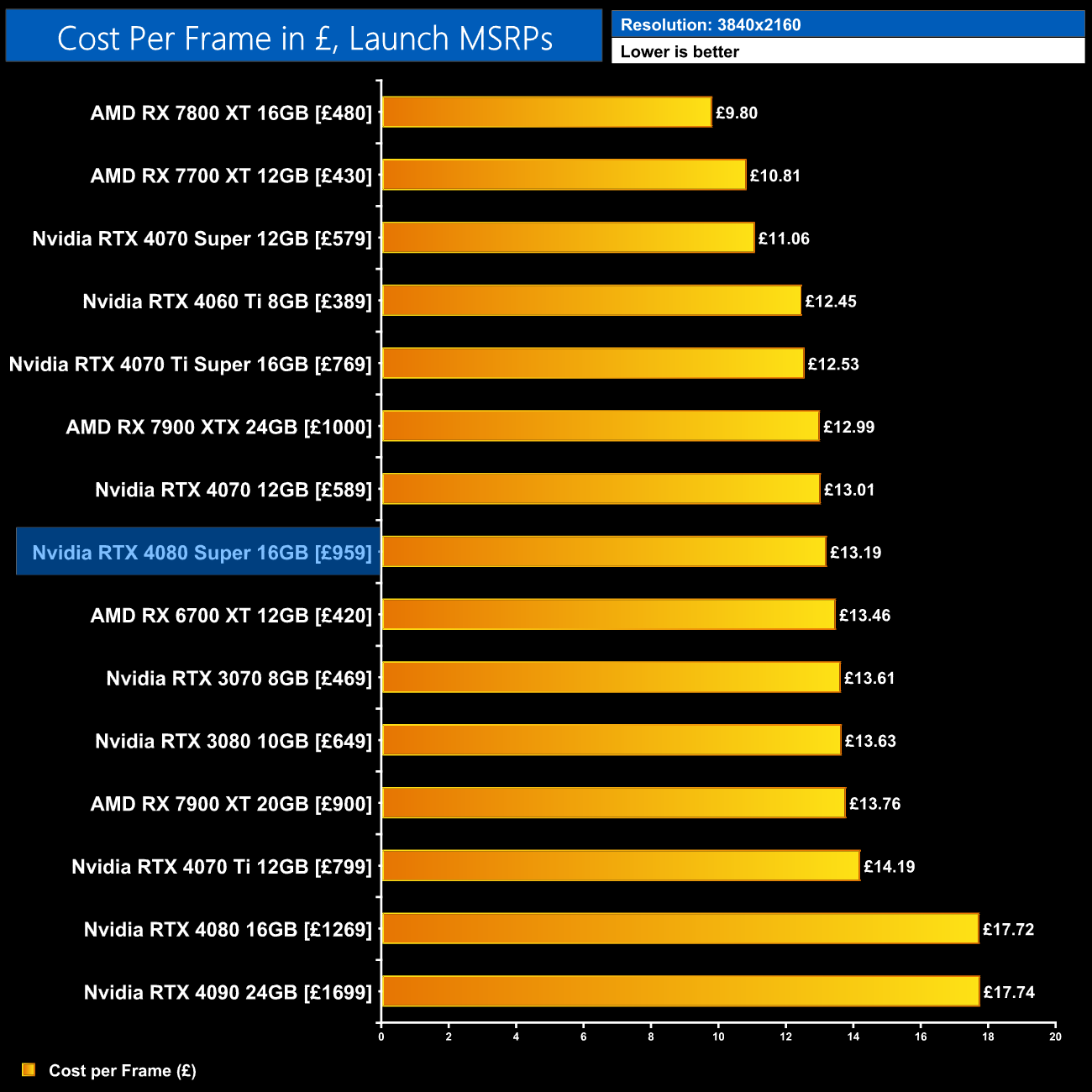 Considering the 4080 Super performs the same as the 4080, but with a UK MSRP that's £310 lower at launch, overall value is improved a fair it, as cost per frame comes in 26% lower with the new model. That makes it basically on par with the RTX 4070 using its original launch MSRP, though it's still hardly an improvement over the RTX 3080 10GB which launched at £649.