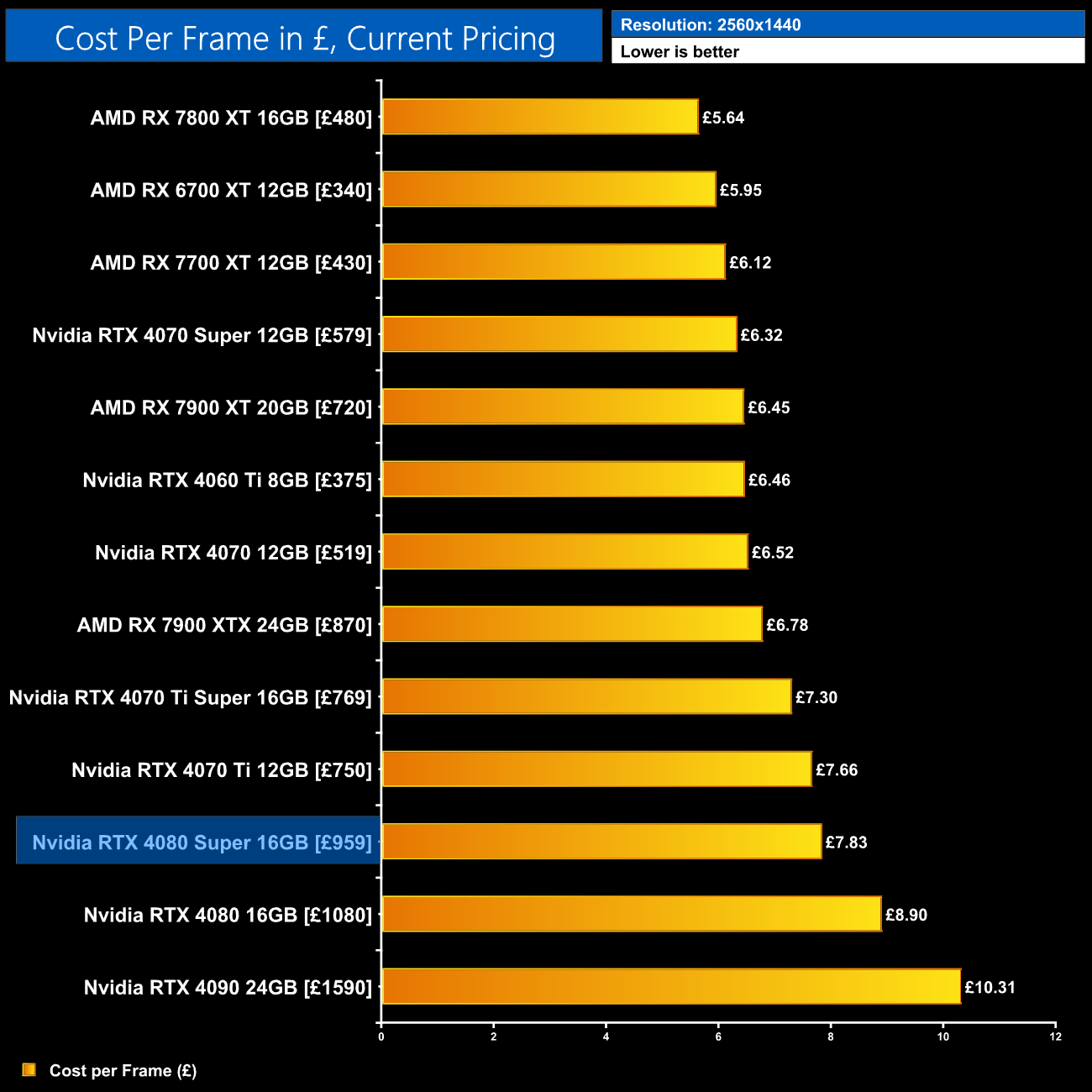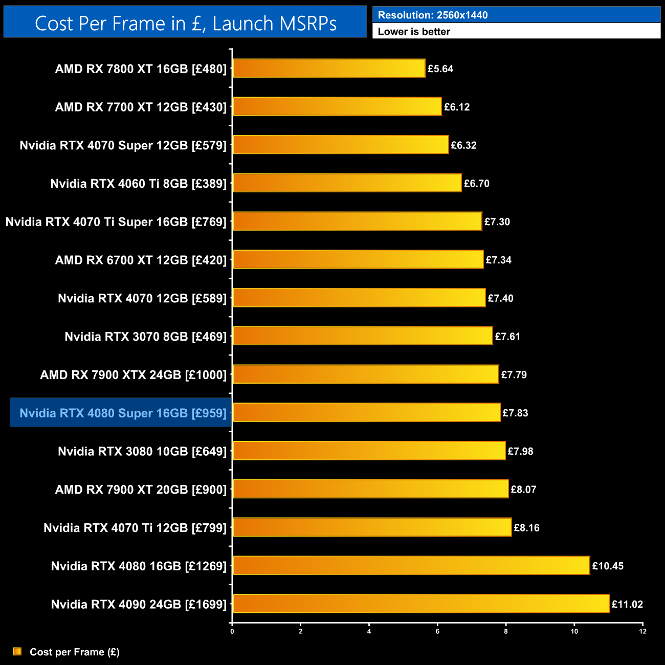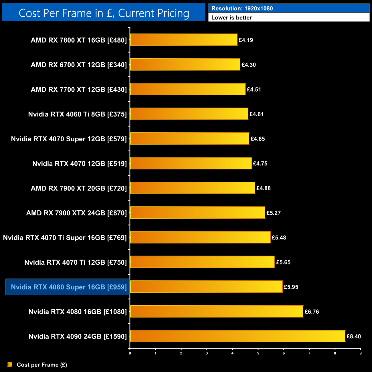 Considering the 4080 Super performs the same as the 4080, but with a UK MSRP that's £310 lower at launch, overall value is improved a fair it, as cost per frame comes in 26% lower with the new model. That makes it basically on par with the RTX 4070 using its original launch MSRP, though it's still hardly an improvement over the RTX 3080 10GB which launched at £649.