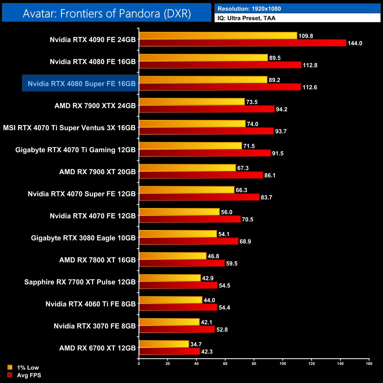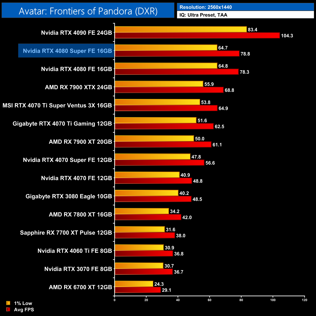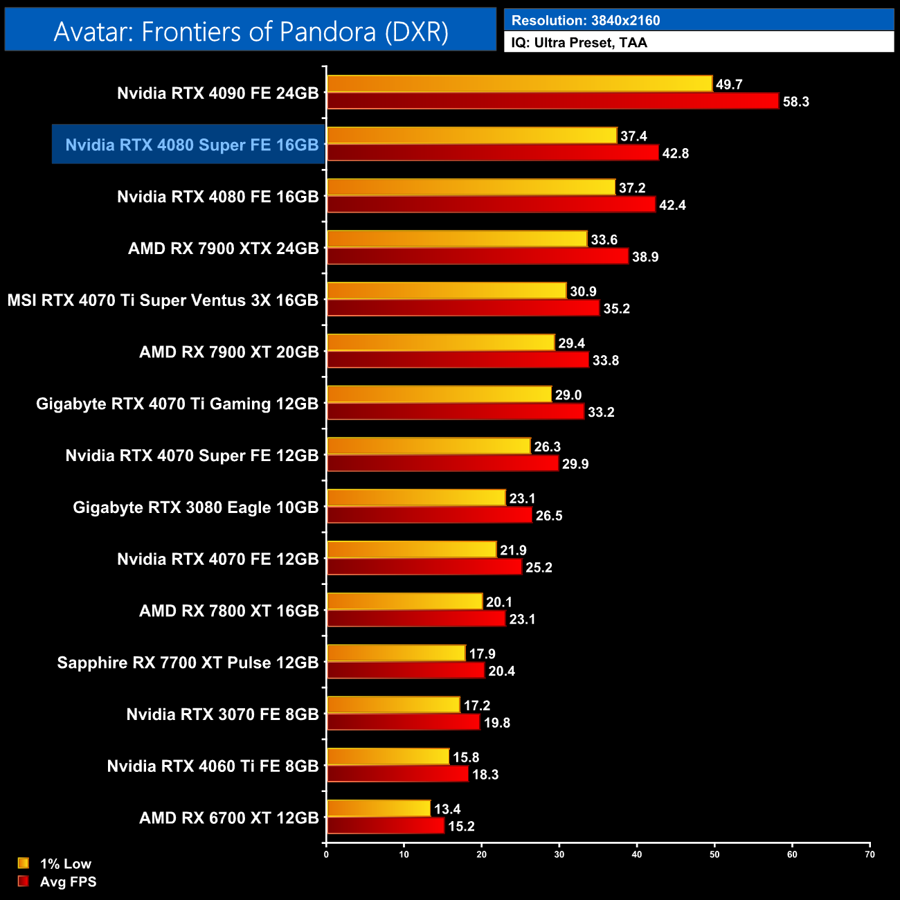 Avatar: Frontiers of Pandora sees a 10% lead for the 4080 Super over the 7900 XTX at 4K, though it's no faster than the original RTX 4080.
