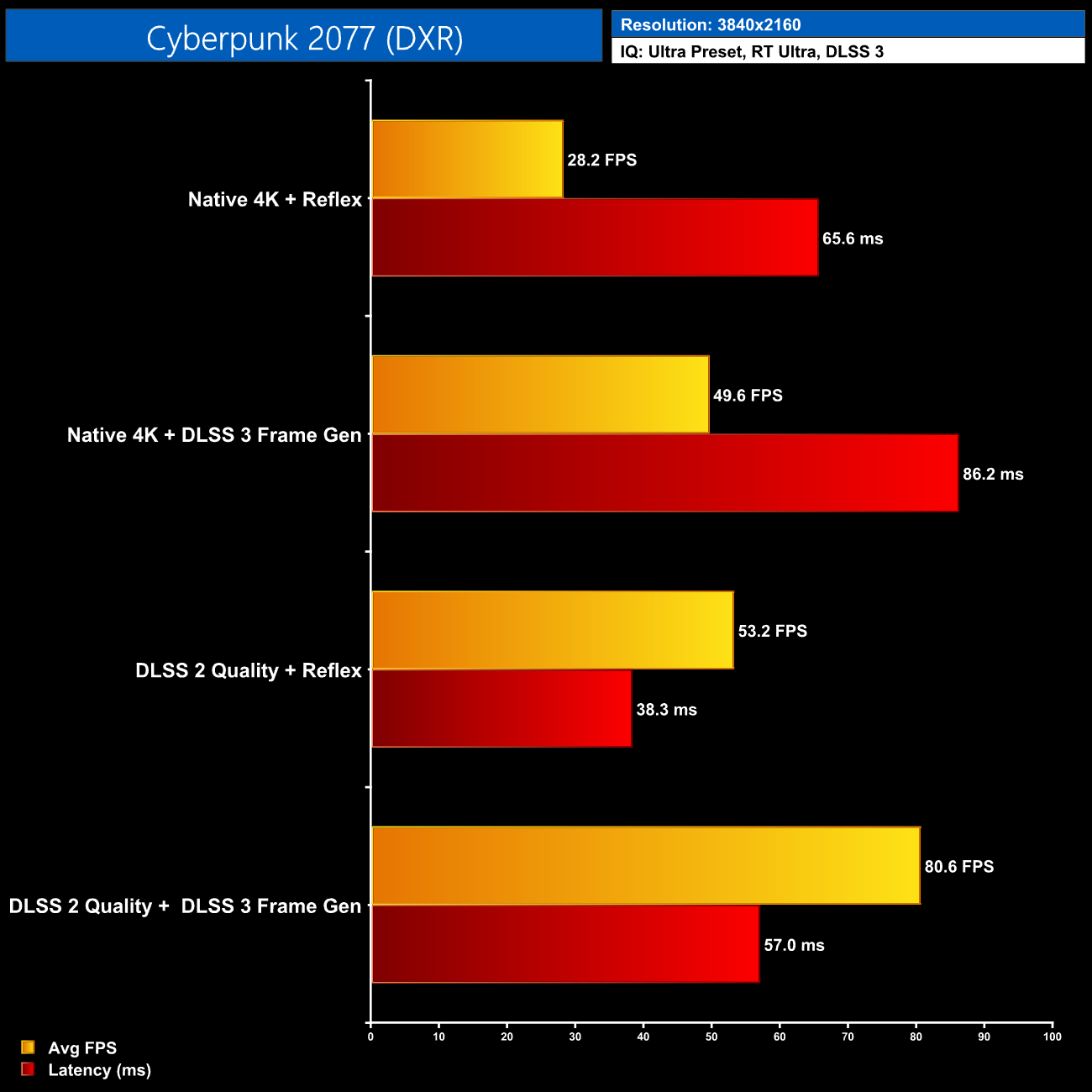 Enabling DLSS 3 Frame Generation in Cyberpunk 2077 sees the frame rate increase from 28FPS, up to 50FPS, at the cost of higher latency, averaging 86ms. DLSS 2 Quality actually offers higher frame rates than just Frame Gen, but using both together nets a frame rate north of 80FPS, while latency comes in at 57ms.