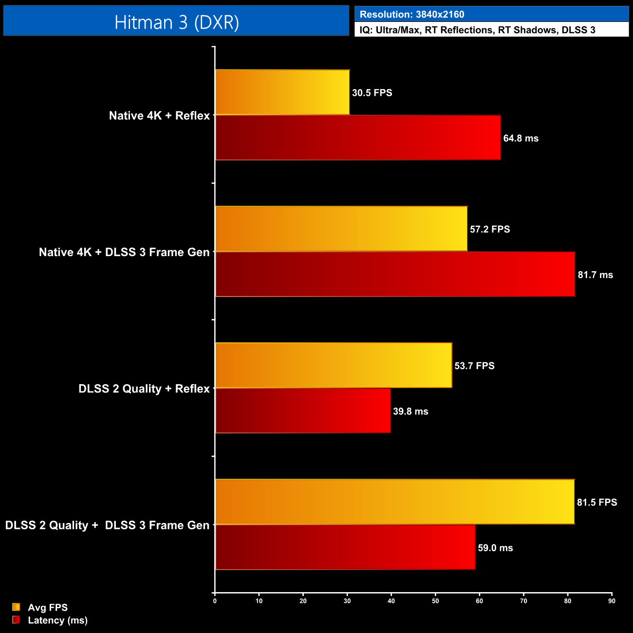 Hitman 3 shows another big improvement to frame rates when using DLSS, as we hit 57FPS and 53FPS when using Fame Gen and DLSS 2 Quality, respectively – the main difference is latency, which is about halved when using DLSS 2. Combing both features results in 82FPS on average, and latency a touch below what we saw at native resolution.