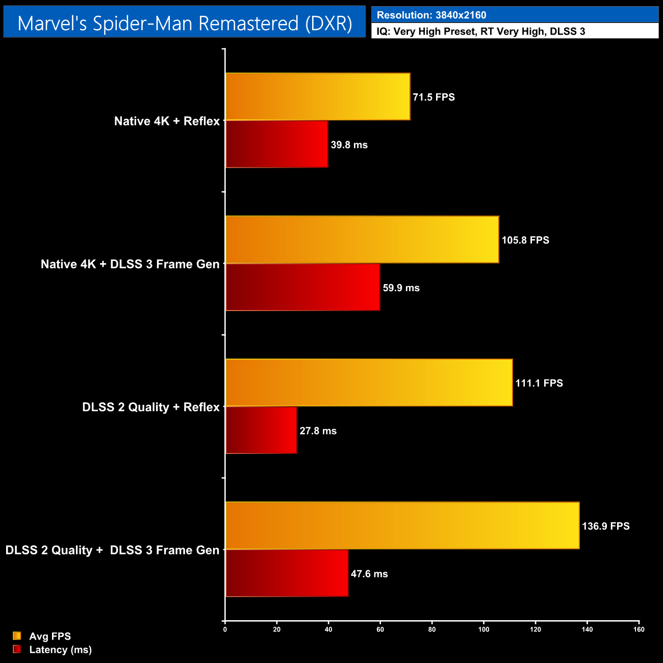 Lastly, Spider-Man Remastered sees similar results, with DLSS 2 Quality boosting frame rates to 111FPS while reducing latency, compared to native. DLSS 3 Frame Gen on its own gets up to a similar frame rate but with twice the latency, while using DLSS 2 plus Frame Gen increases FPS to just below 140, with latency at 47.6ms.