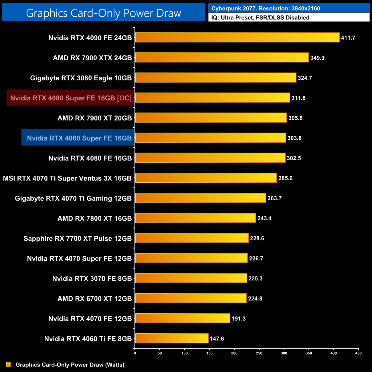 Power draw also rose when overclocked, up from 304W stock to 312W overclocked, though that's a trivial difference in the grand scheme of things.