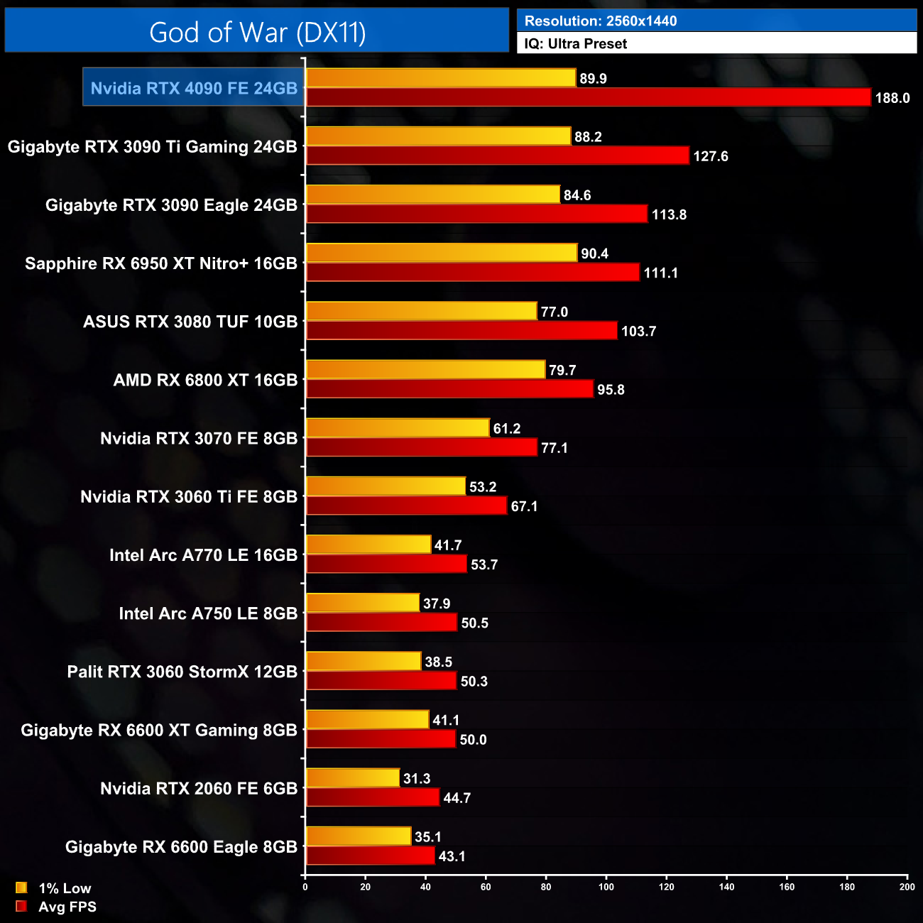 In God of War, we see decent enough scaling at 1440p, though the 1% lows seem to hit a bit of a wall around the 90FPS mark. I'm not sure if that's down to the scene I test or if it's just a quirk of the game engine, so we'll move on to the 4K results.