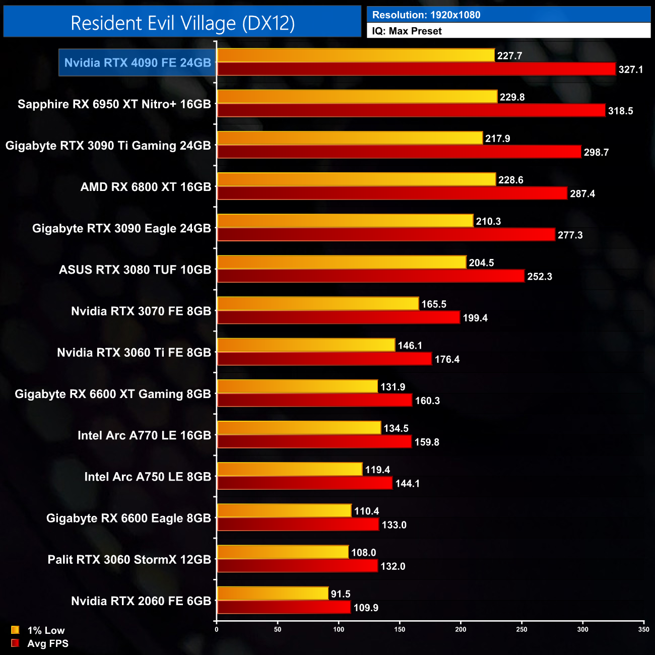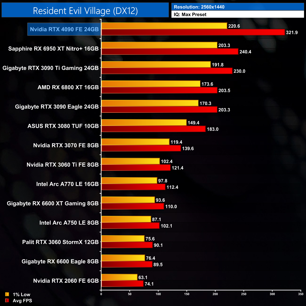 Resident Evil Village is next and this one scales quite well to very high frame rates, with the RTX 4090 pushing over 320FPS at 1440p. Whether or not you need that sort of performance for a game like this is another matter, but still, the 40% boost over the 3090 Ti isn't bad, though compared to the 6950 XT we're looking at a 34% uplift.