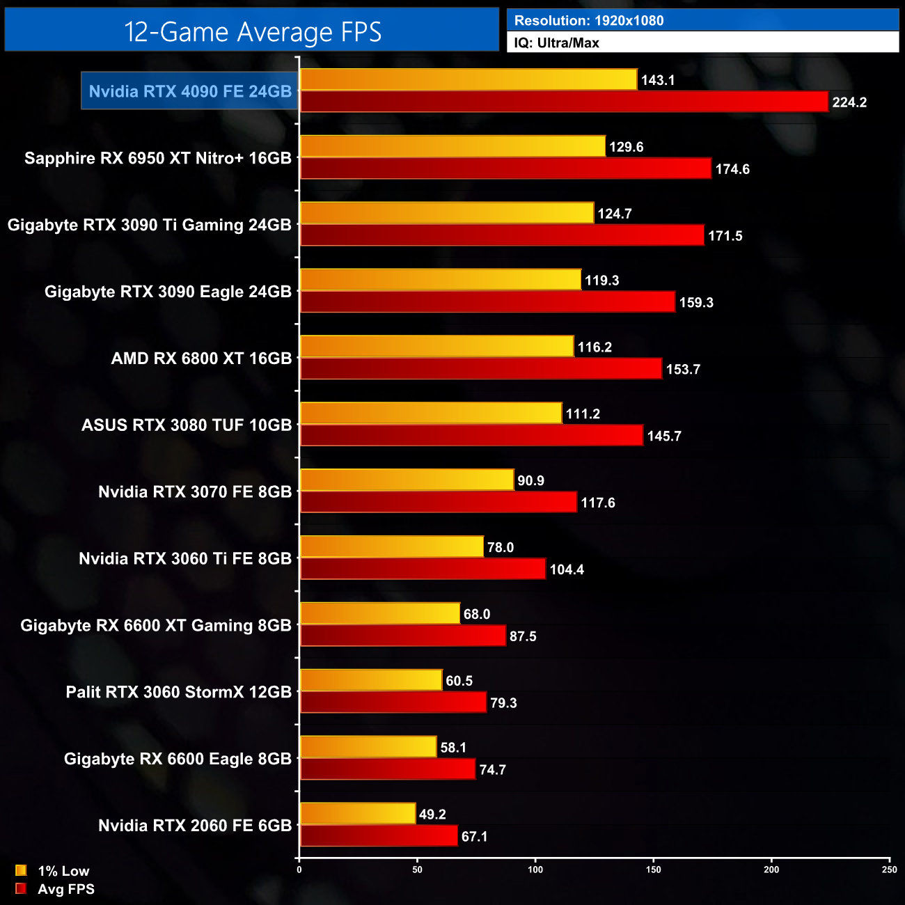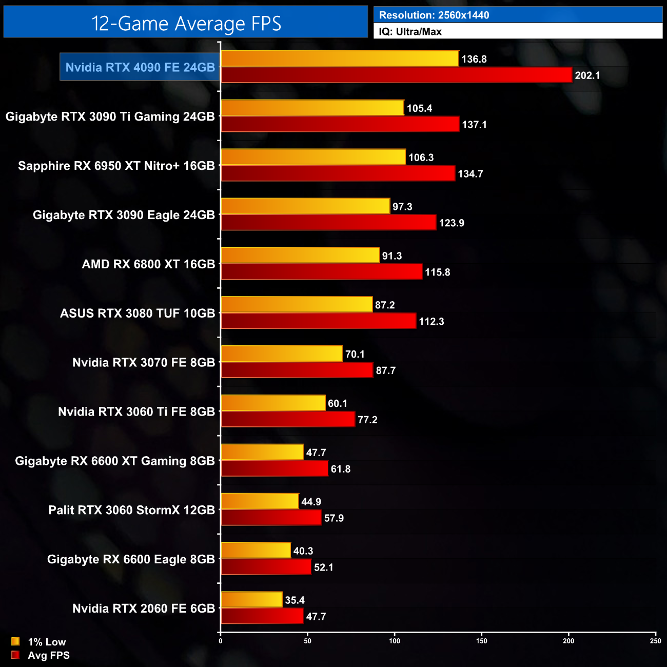 Taking a look at the big picture overview, the RTX 4090 goes straight to the top of the chart as we would expect. At 1440p it delivers an average of 202FPS, and that makes it 48% faster on average compared to the RTX 3090 Ti. Against the RTX 3090, we're looking at a 63% uplift, while it's exactly 50% faster than AMD's current fastest, the RX 6950 XT.