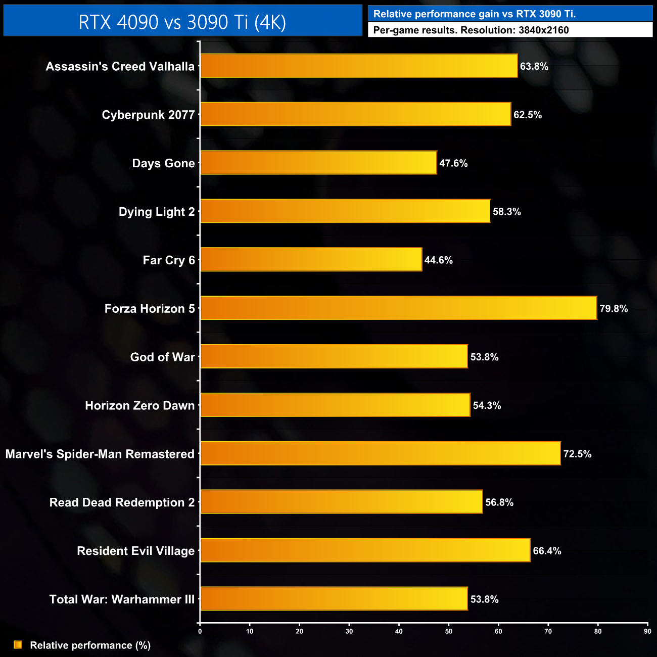 It's worth taking a closer look at the comparison between the RTX 4090 and RTX 3090 Ti at 4K. While we see a 60% uplift on average, some games scale significantly better than others, as we can see above. Days Gone and Far Cry 6, for instance, are relatively poor performers, and while there's a good stack of games in that 50-60% range, we do see a couple pushing over 70% versus the 3090 Ti.