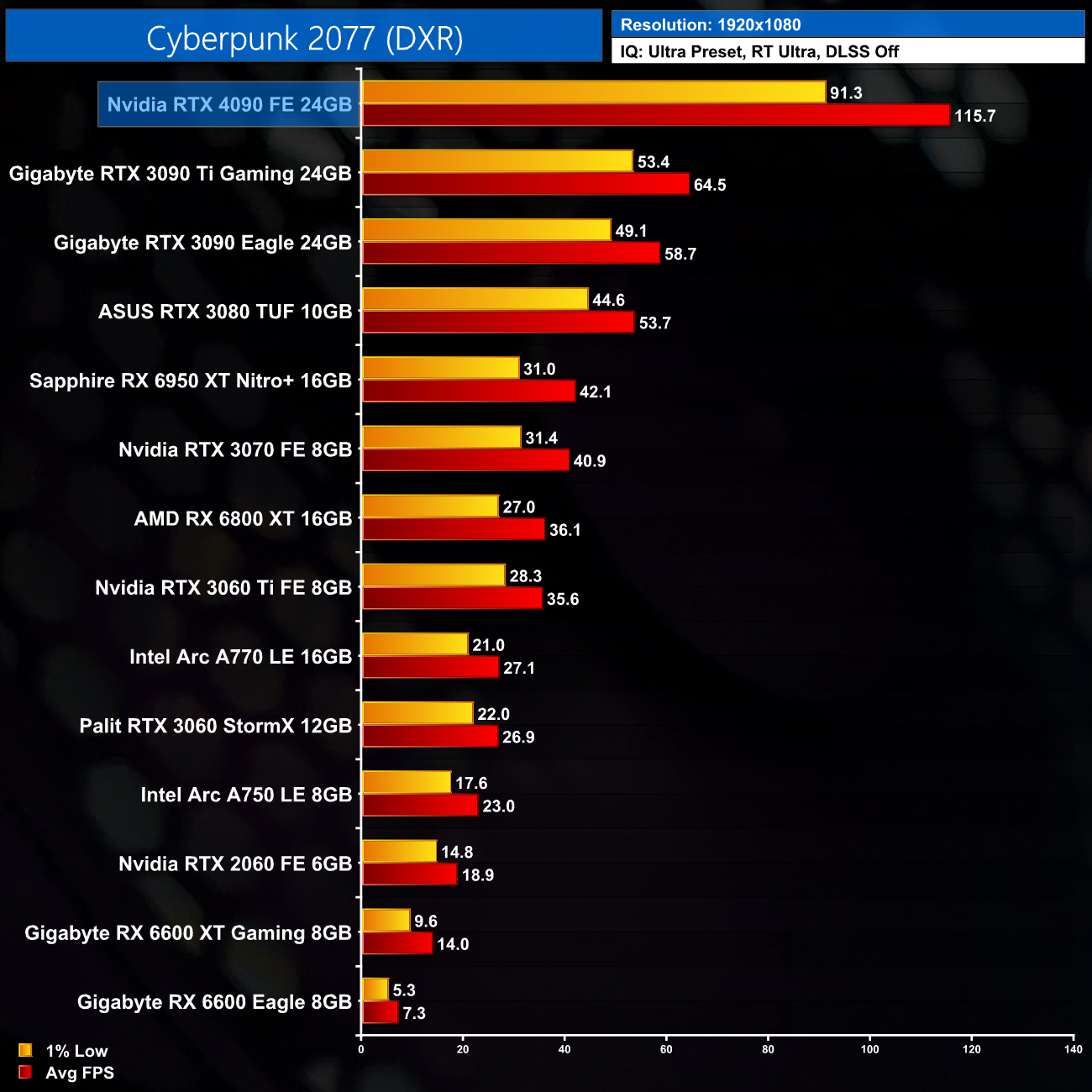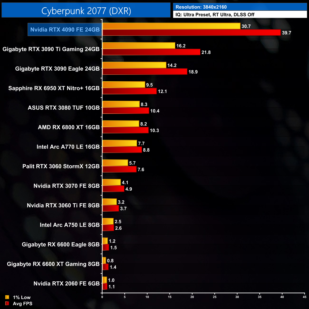 Here we test Cyberpunk 2077, using the Ray Tracing: Ultra preset, but with DLSS disabled.