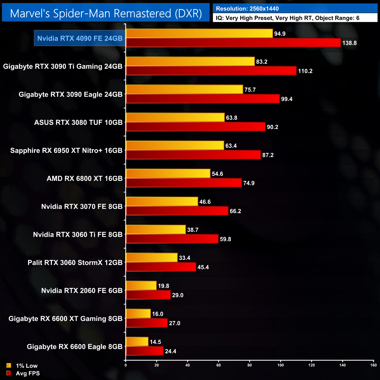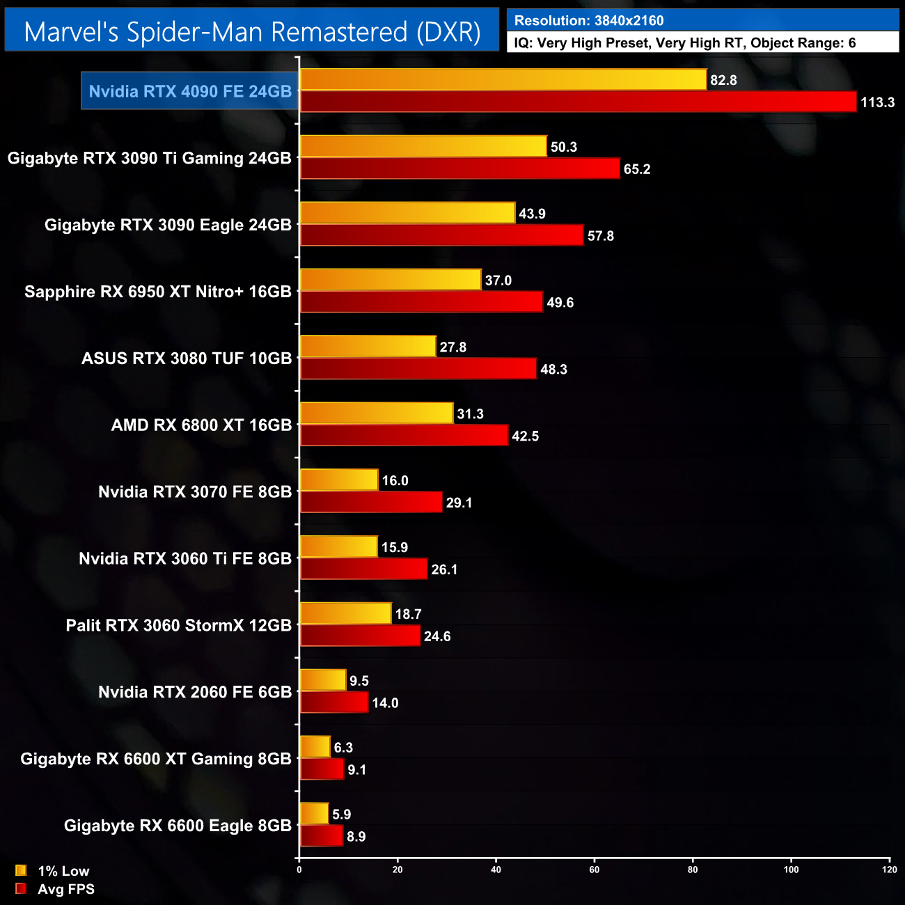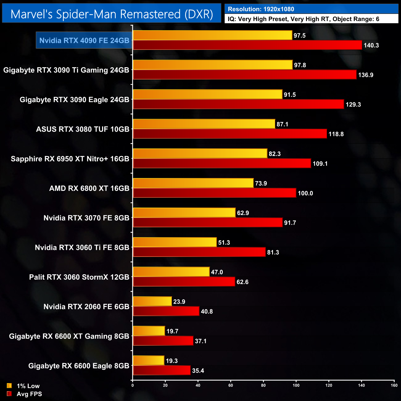 Here we test Marvel's Spider-Man Remastered, with the in-game ray tracing effects set to Very High, Object Range set to 6.