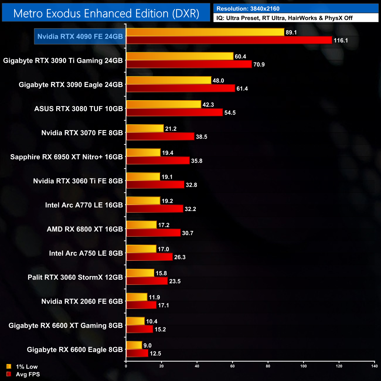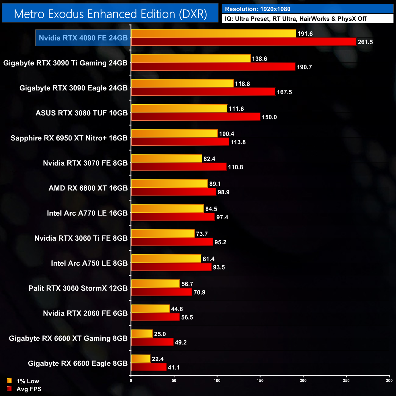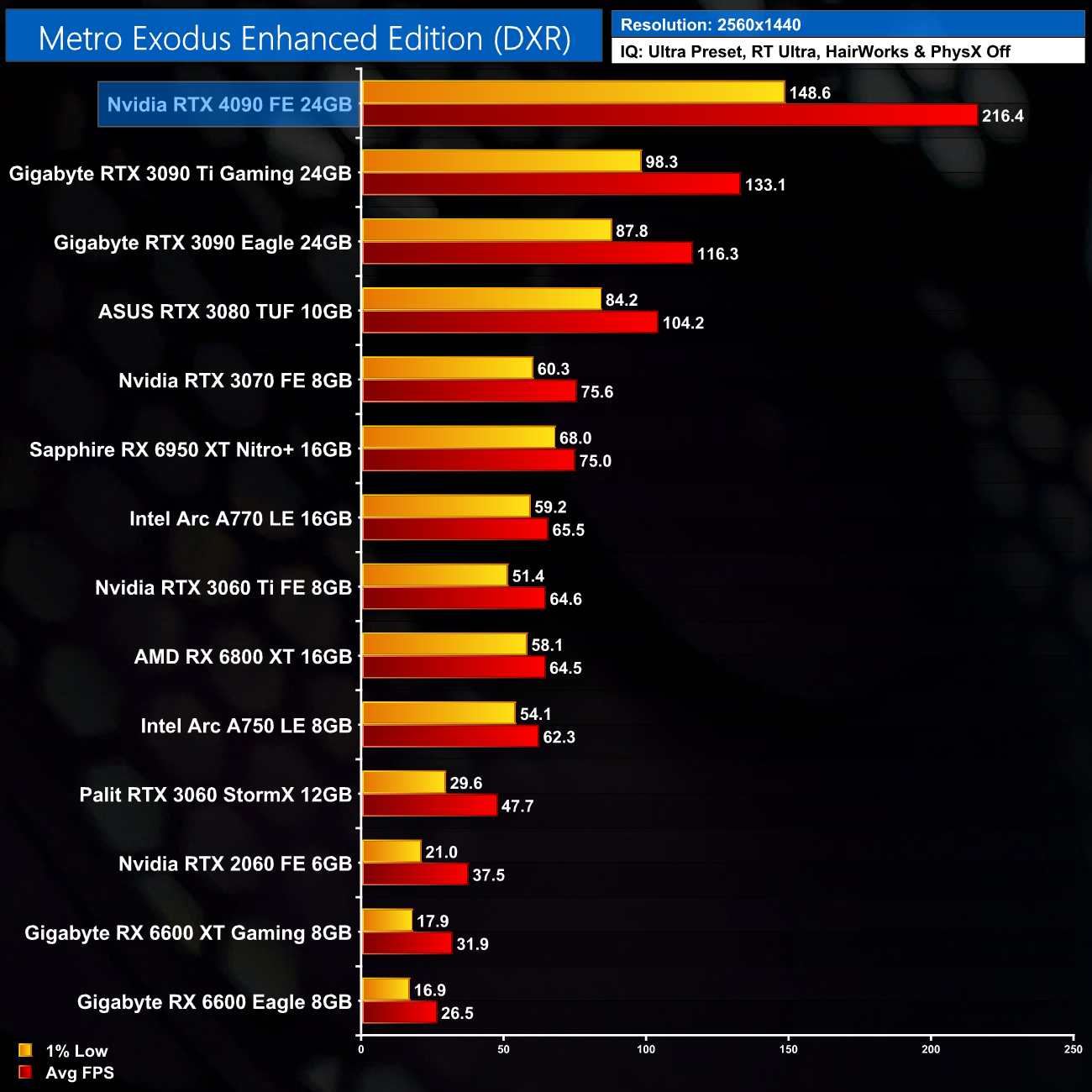 Metro Exodus Enhanced Edition is next, with this game straight up requiring a DXR-capable GPU to run, with every light source in the game being fully ray-traced. At 1440p, the RTX 4090 stomps through our test sequence, hitting 216 FPS, equalling a 63% uplift versus the RTX 3090 Ti.