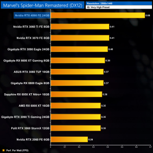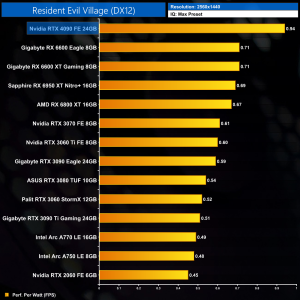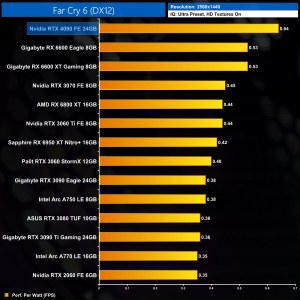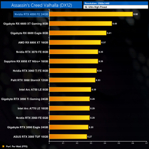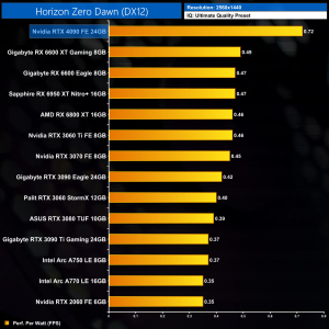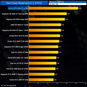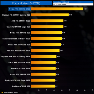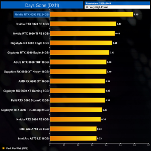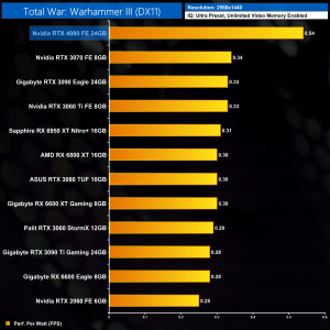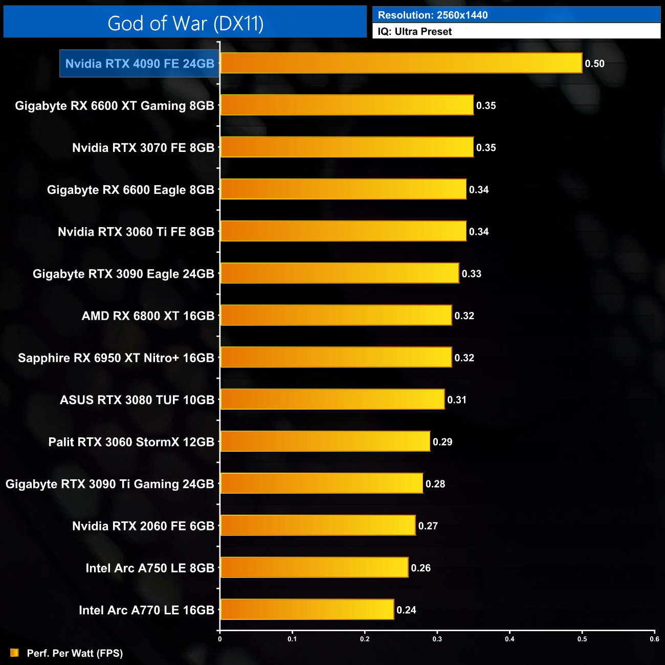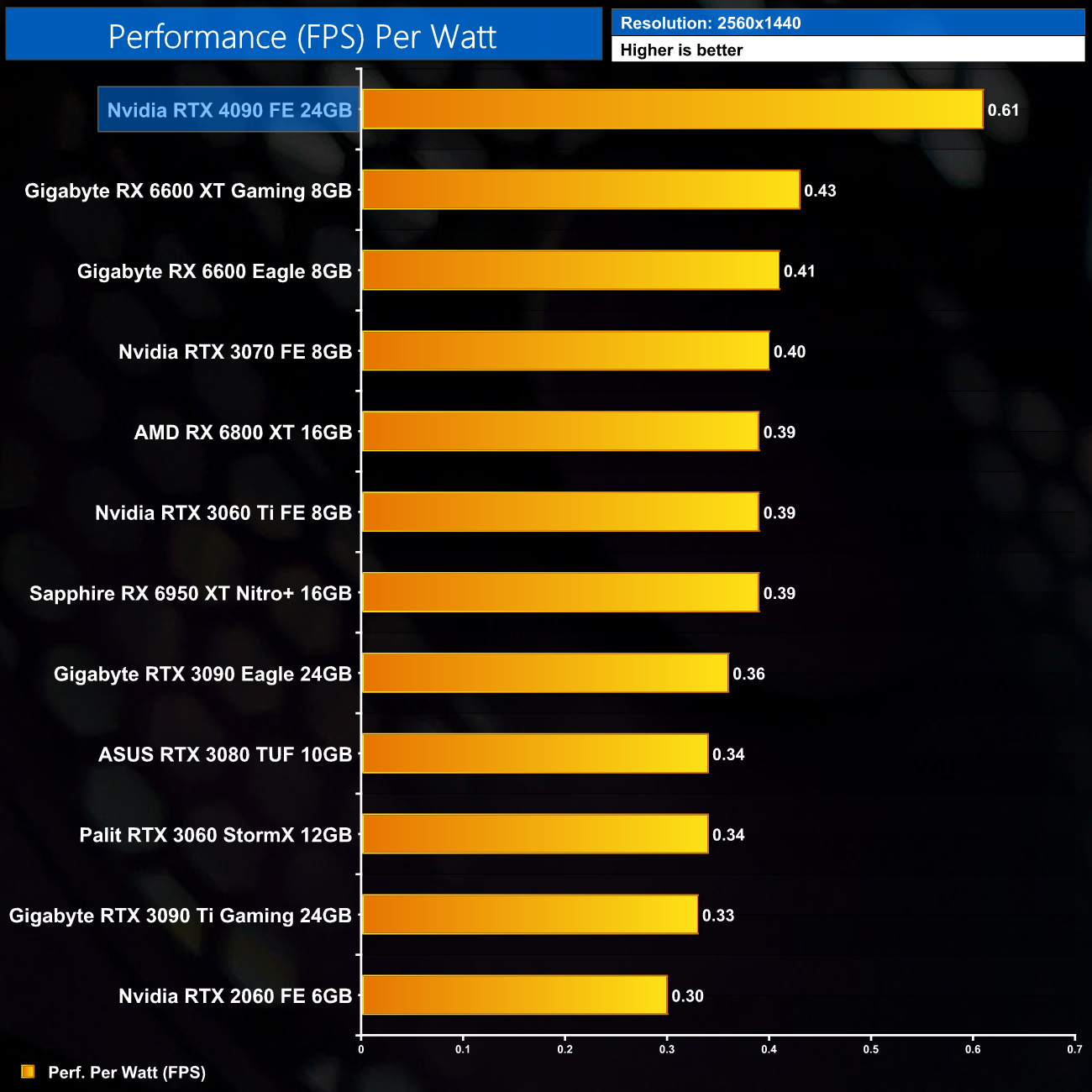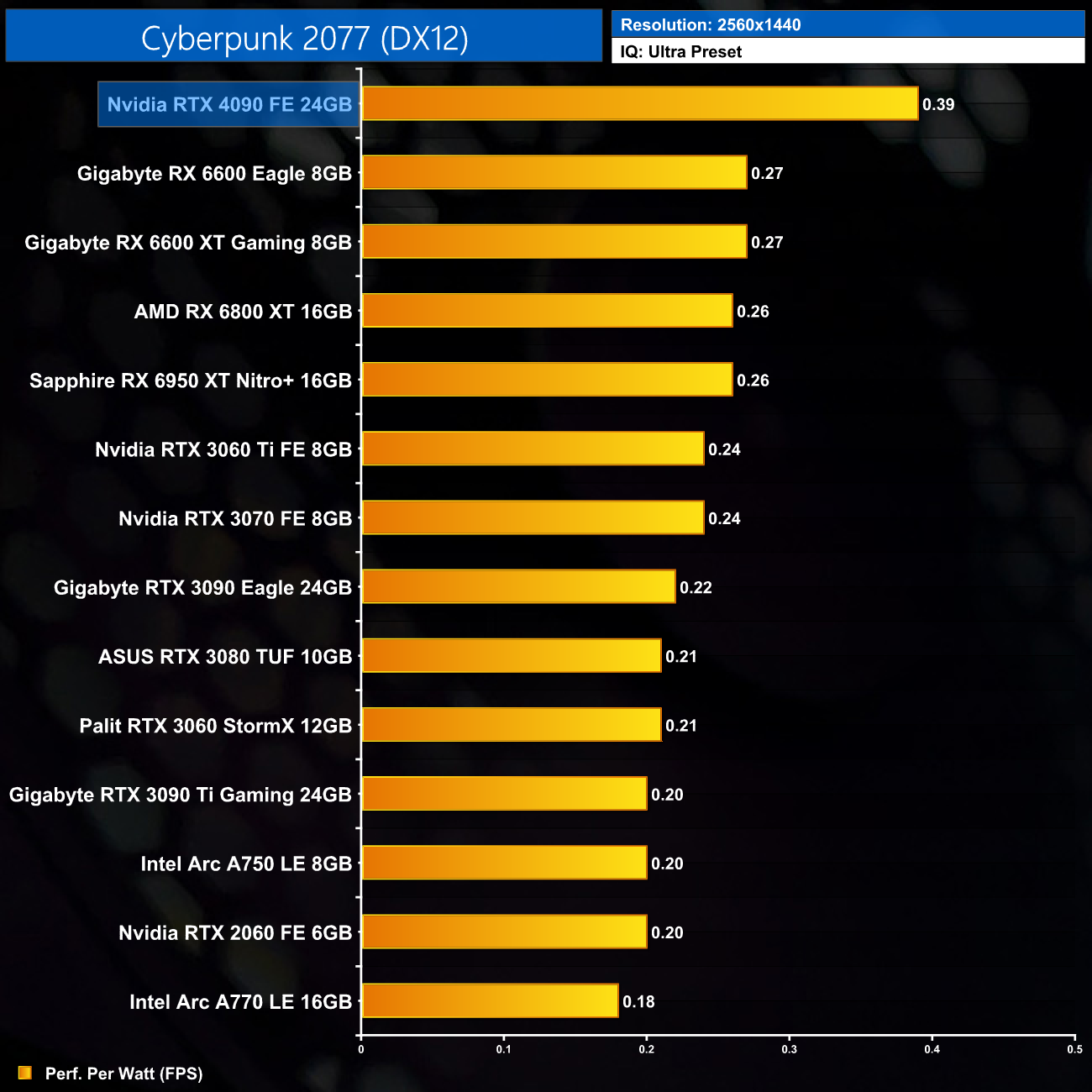 Performance per Watt at 1440p scales in favour of the RTX 4090. It delivers a 42% improvement over the second-most efficient GPU, the RX 6600 XT, but compared to the RTX 3090 Ti it's 85% more performant per Watt.