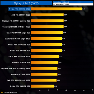Using the graphics card-only power draw figures presented earlier in the review, here we present performance per Watt on a per-game basis for all twelve games we tested at 1440p.