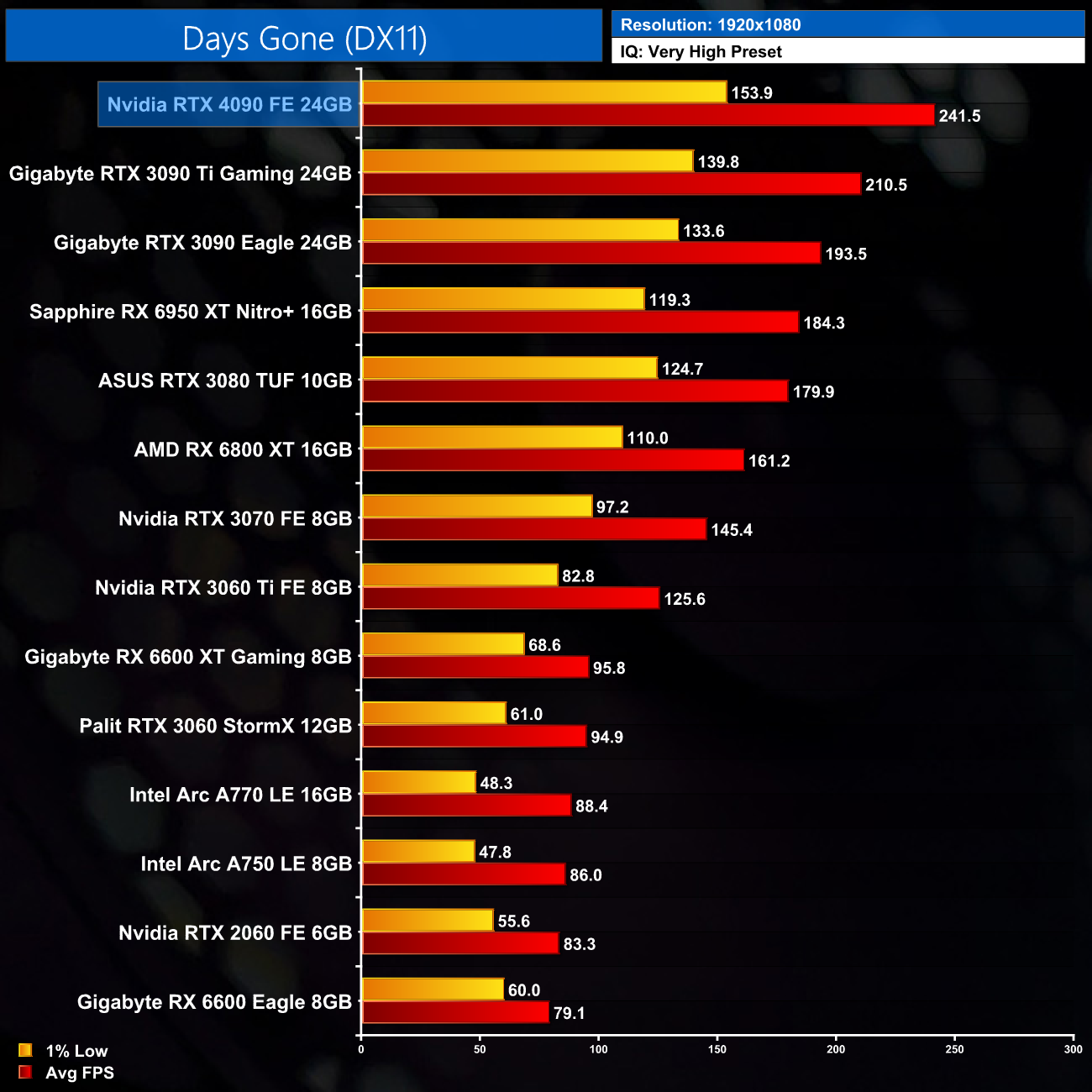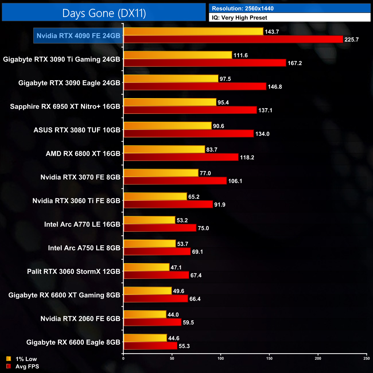 As we will see from a few titles on test today, not every game scales as well with the new Ada silicon. Days Gone is one such title, and while performance is still chart-topping, the RTX 4090 is just 35% ahead on average compared to the RTX 3090 Ti, with the 1% lows seeing an even smaller 29% boost.