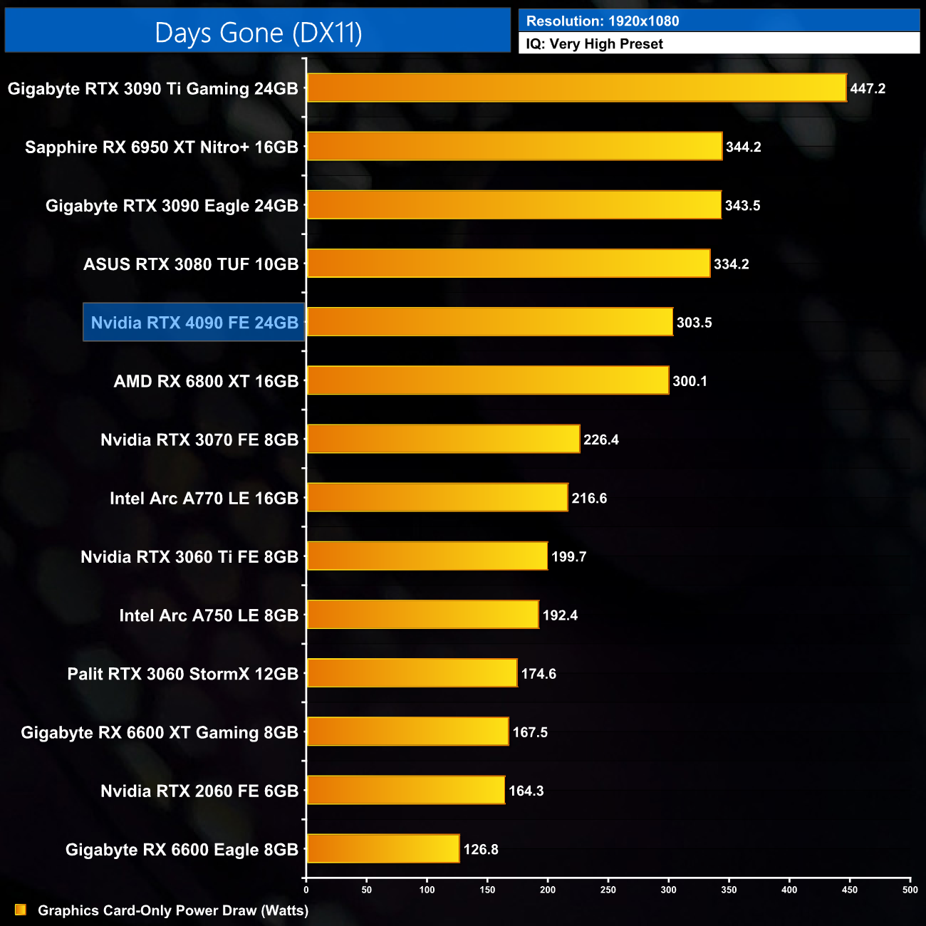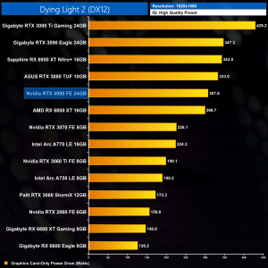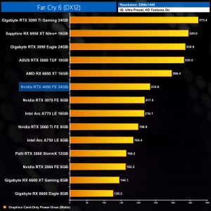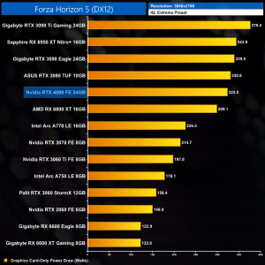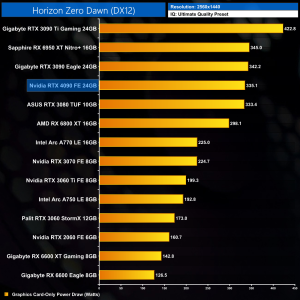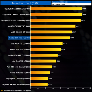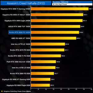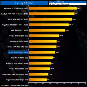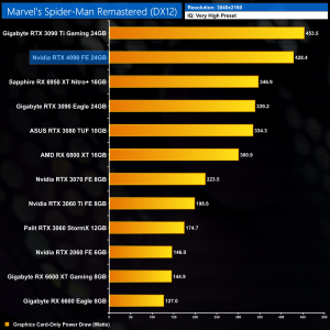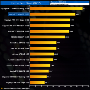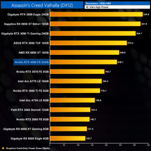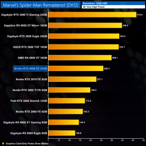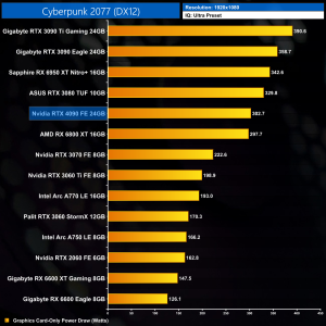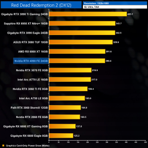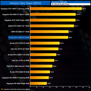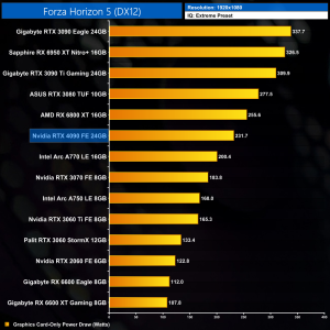 Graphics card-only power draw paints an interesting picture at 1080p, where the 4090 is rather under-utilised. It drew an average of 277W at this resolution across our testing – be sure to check out the per game results at the top of the page.