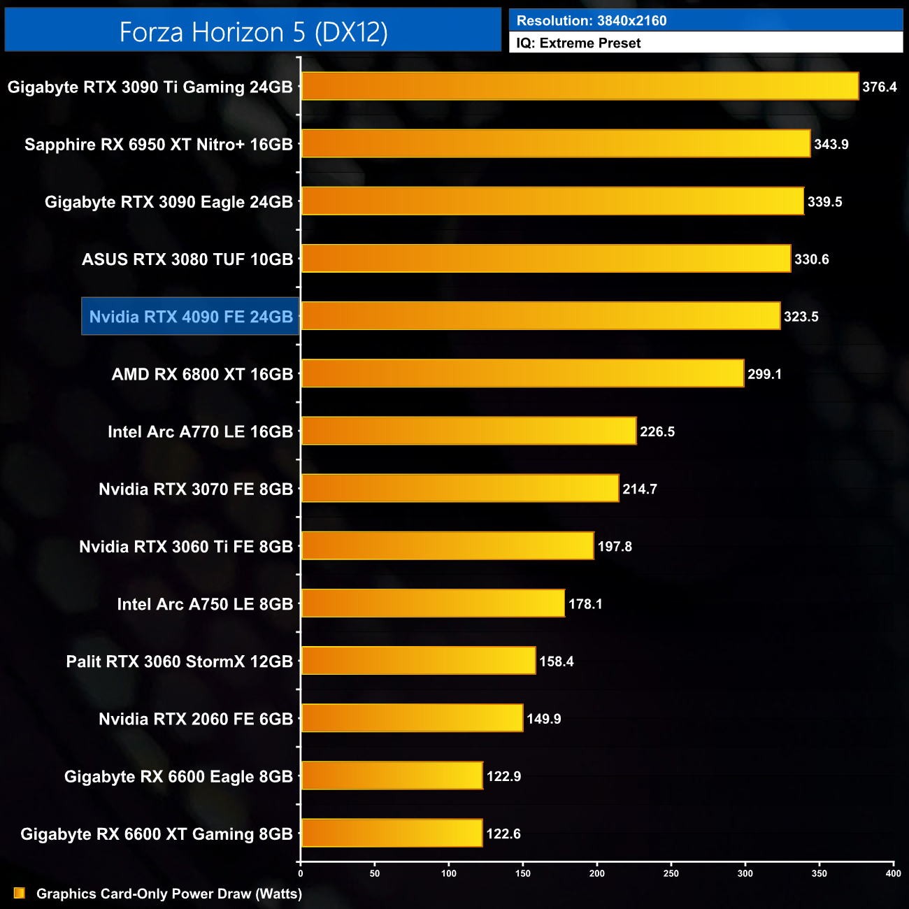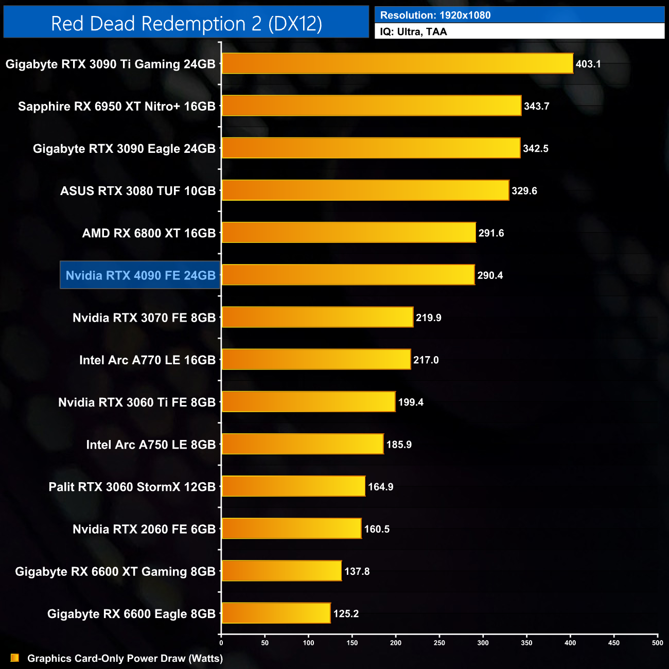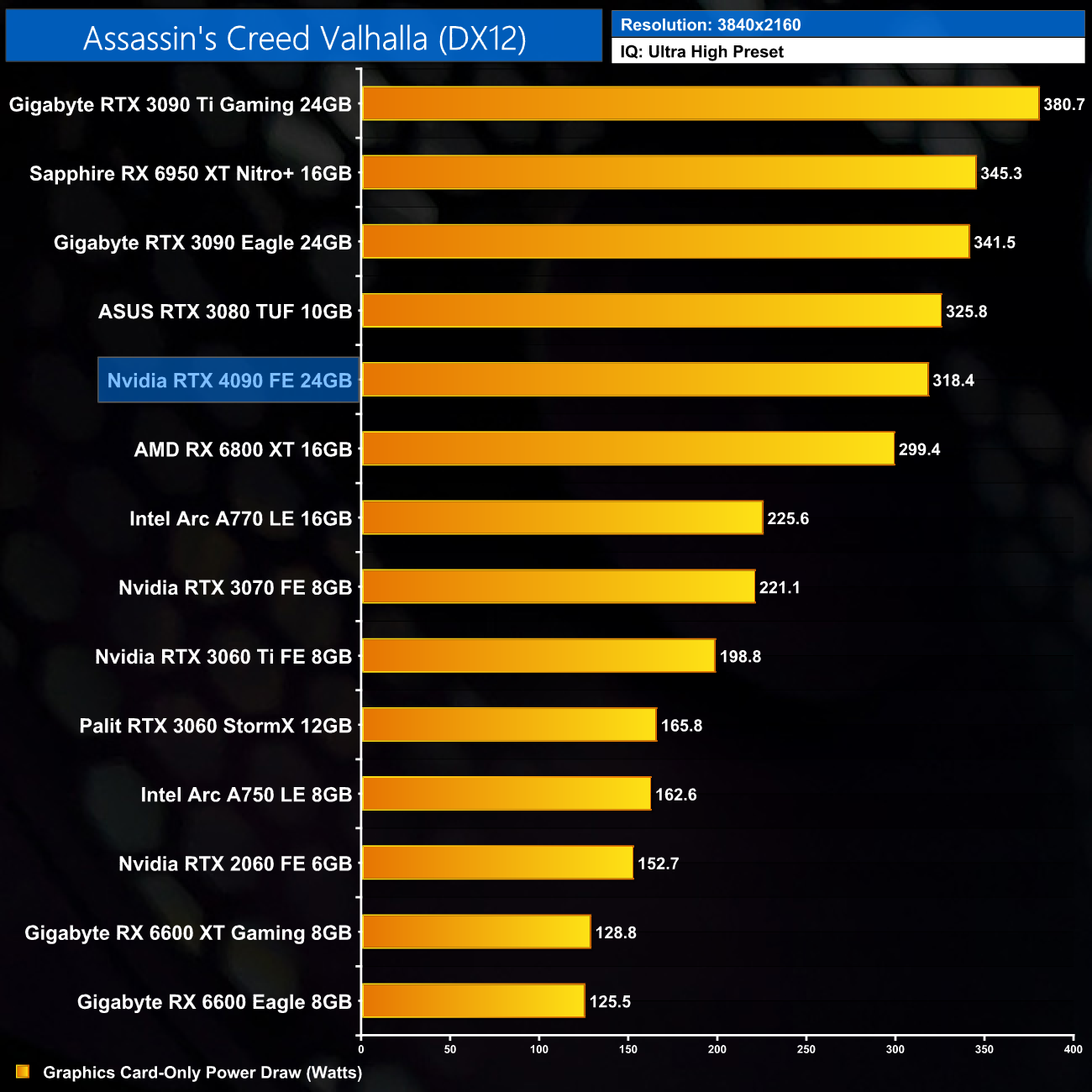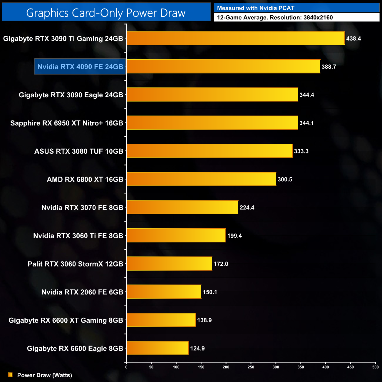 Here we present power draw figures for the graphics card-only, on a per-game basis for all twelve games we tested at 2160p (4K). This is measured using Nvidia's Power Capture Analysis Tool, also known as PCAT. You can read more about our updated power draw testing methodology HERE.