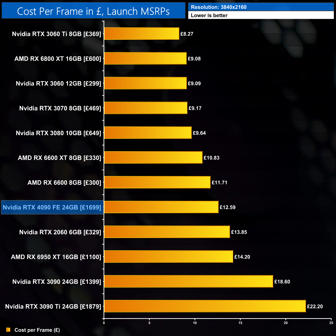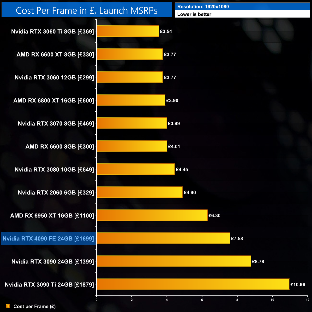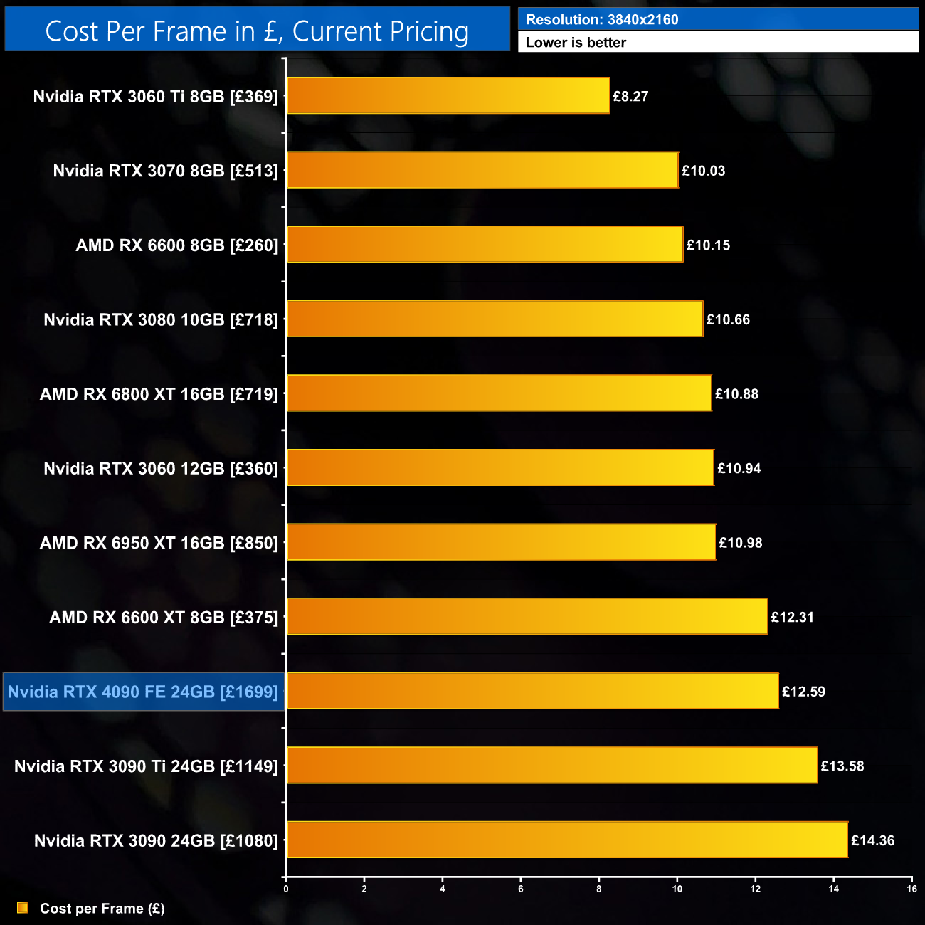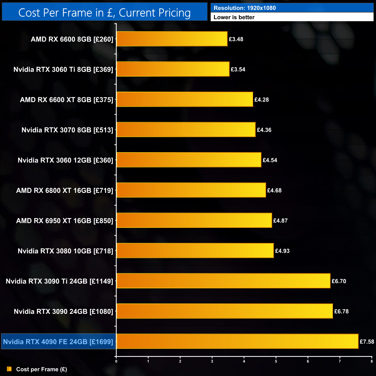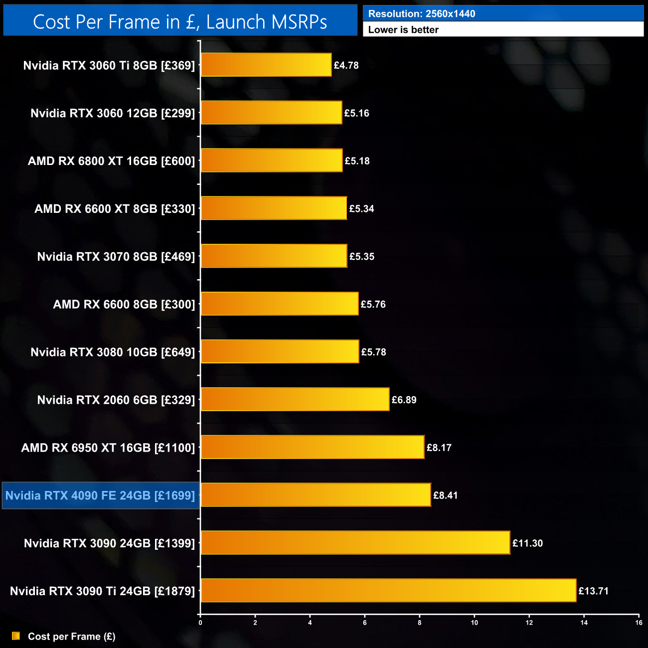 At 1440p, we see the RTX 4090 costs £8.41 for every frame produced, a reduction of 26% against the RTX 3090, and 36% against the RTX 3090 Ti. As expected given the £1699 asking price, however, numerous GPUs are better value for 1440p gaming, including the 6950 XT.