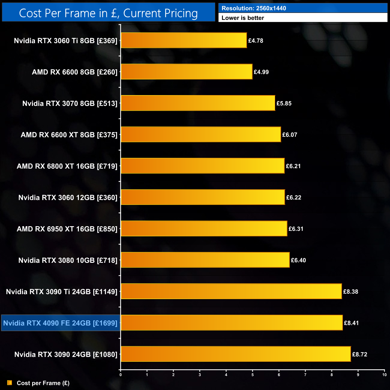 This data changes the picture, with the 4090's 1440p cost per frame matching the RTX 3090 Ti almost exactly, which is clearly less impressive.