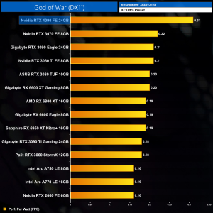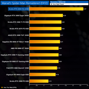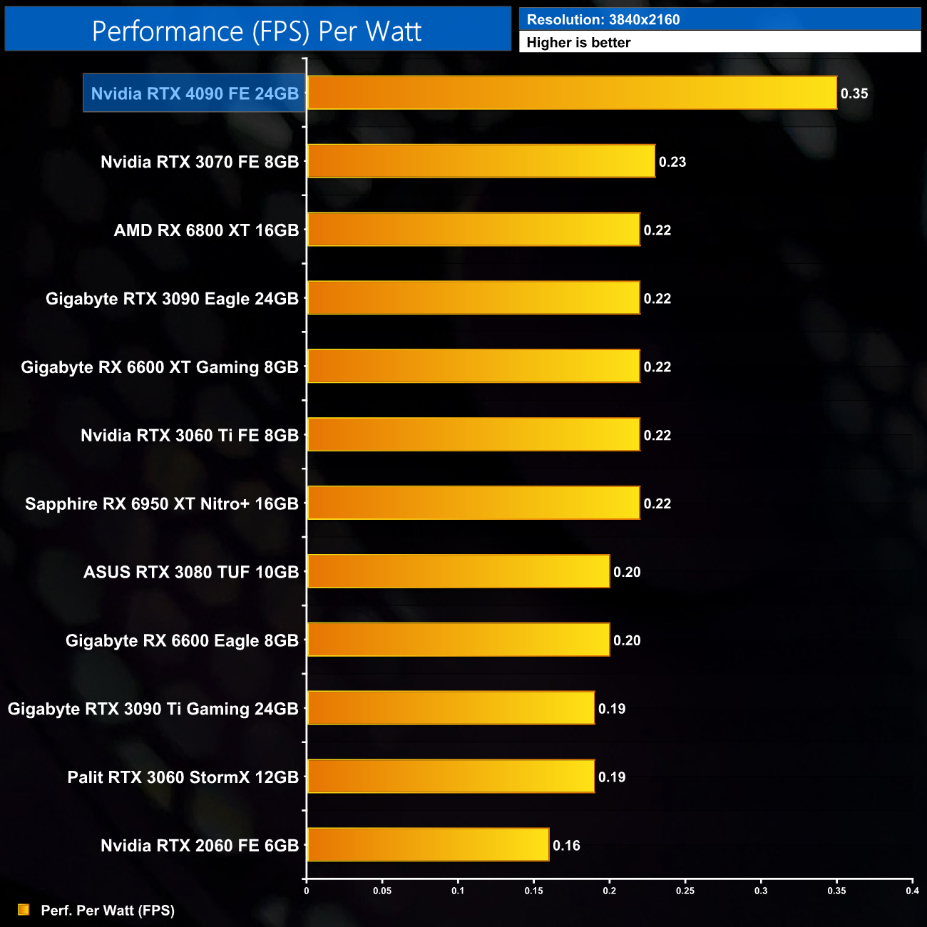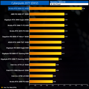 Lastly, at 4K, the RTX 4090 is in a class of its own in terms of efficiency. Its next closest rival is the RTX 3070, but the 4090 is still over 50% more efficient, and that increases to 84% when compared to the RTX 3090 Ti. It is highly impressive how efficient the Ada architecture is, and we'd expect this to only get better on the lower-power SKUs.