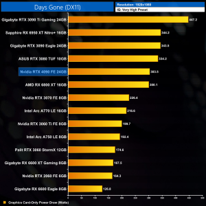 It's worth taking a closer look at the comparison between the RTX 4090 and RTX 3090 Ti at 4K. While we see a 60% uplift on average, some games scale significantly better than others, as we can see above. Days Gone and Far Cry 6, for instance, are relatively poor performers, and while there's a good stack of games in that 50-60% range, we do see a couple pushing over 70% versus the 3090 Ti.