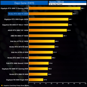 Resident Evil Village is next and this one scales quite well to very high frame rates, with the RTX 4090 pushing over 320FPS at 1440p. Whether or not you need that sort of performance for a game like this is another matter, but still, the 40% boost over the 3090 Ti isn't bad, though compared to the 6950 XT we're looking at a 34% uplift.