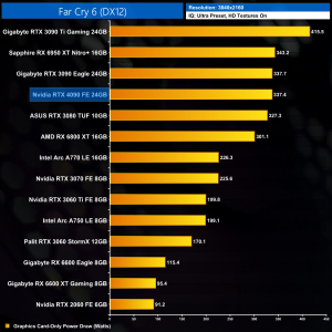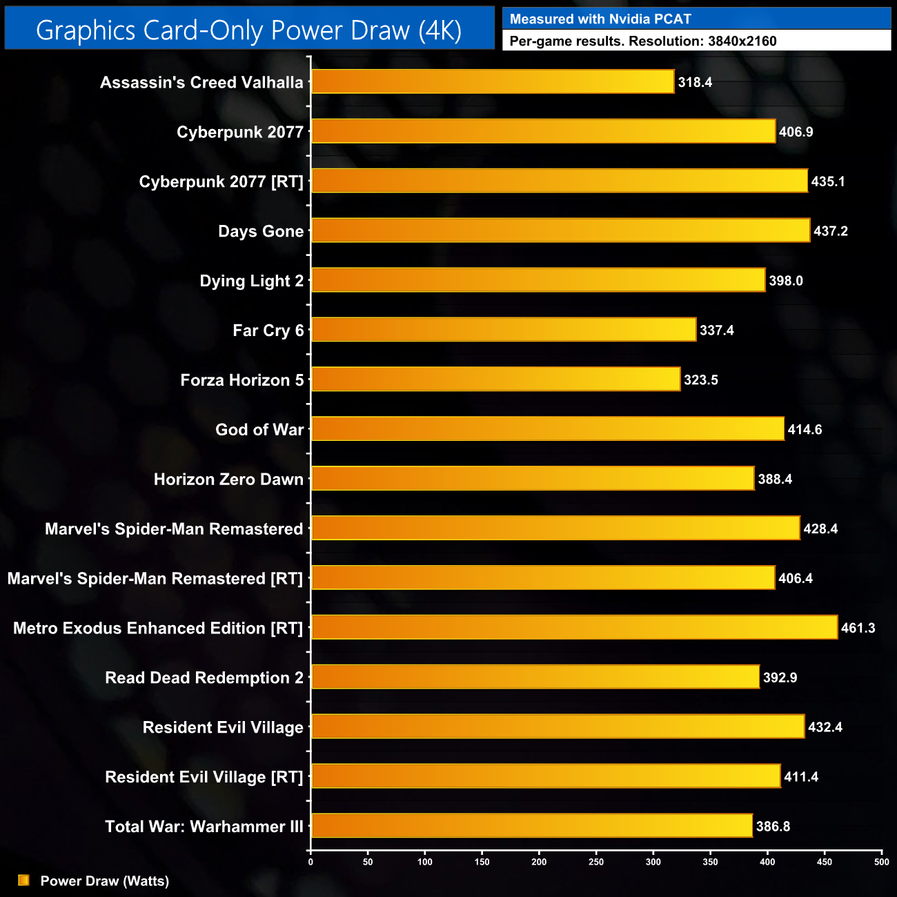You can clearly see just how much variance there is in power draw from this chart above. This also includes our ray-traced benchmarks, with Metro Exodus Enhanced Edition proving to be the most strenuous load, resulting in 461W power draw. Games which historically don't scale as well – including Assassin's Creed Valhalla and Far Cry 6 – see much lower power figures.