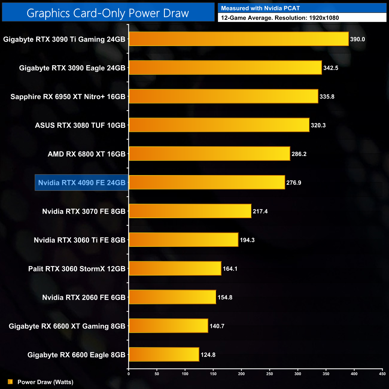 Here we present power draw figures for the graphics card-only, on a per-game basis for all twelve games we tested at 1080p. This is measured using Nvidia's Power Capture Analysis Tool, also known as PCAT. You can read more about our updated power draw testing methodology HERE.