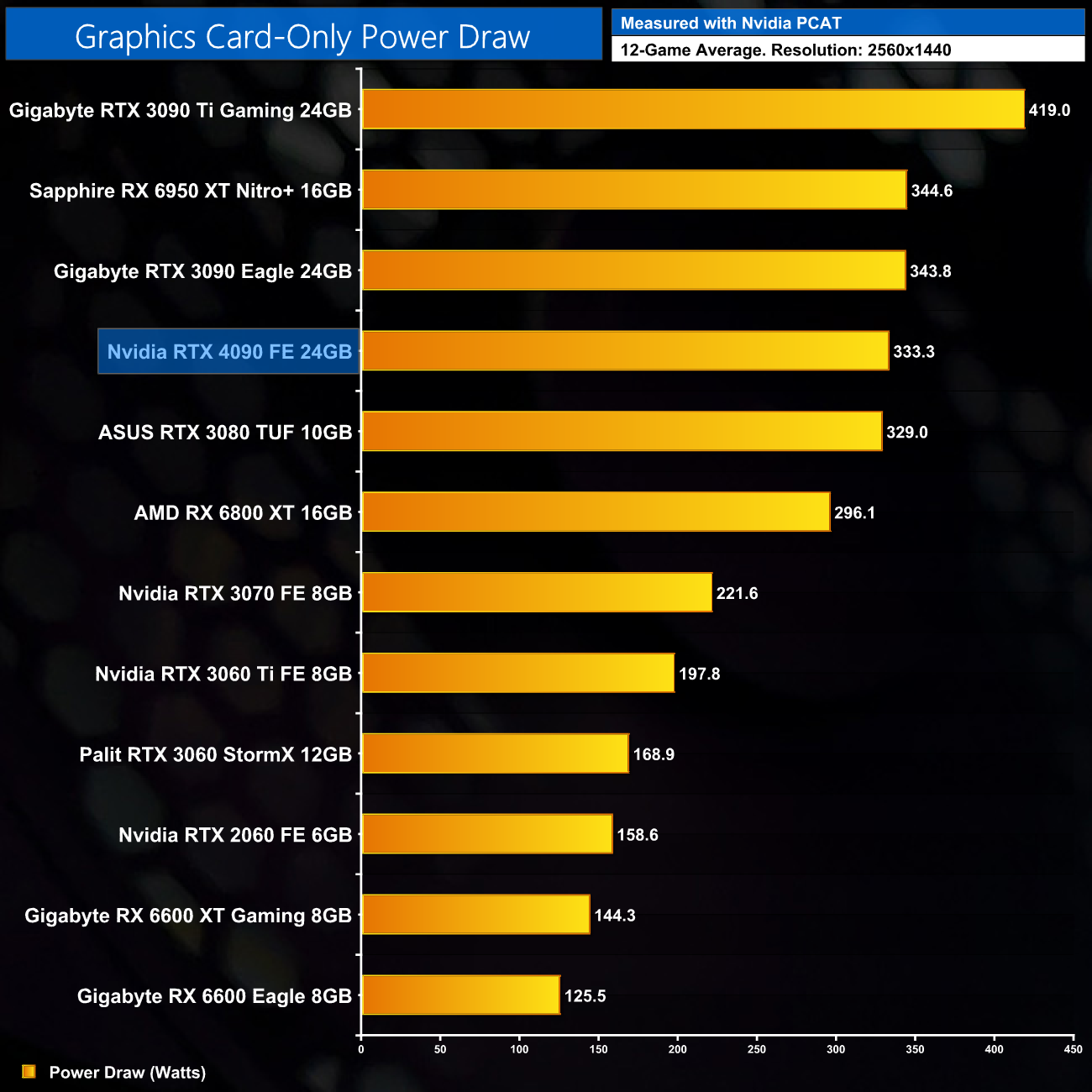 Here we present power draw figures for the graphics card-only, on a per-game basis for all twelve games we tested at 1440p. This is measured using Nvidia's Power Capture Analysis Tool, also known as PCAT. You can read more about our updated power draw testing methodology HERE.