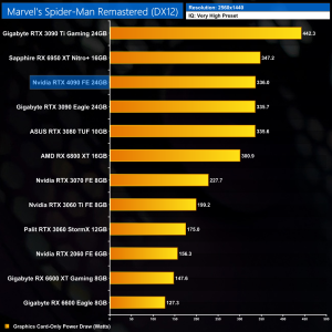 Next up is Marvel's Spider-Man Remastered, and interestingly enough the scaling is quite poor here with ray tracing enabled. At 1440p, the 4090 is only 26% faster than the 3090 Ti, despite being 44% faster with RT turned off. It turns out we're CPU limited, with the 4090 only seeing about 74% GPU utilisation in our test sequence when RT is enabled.