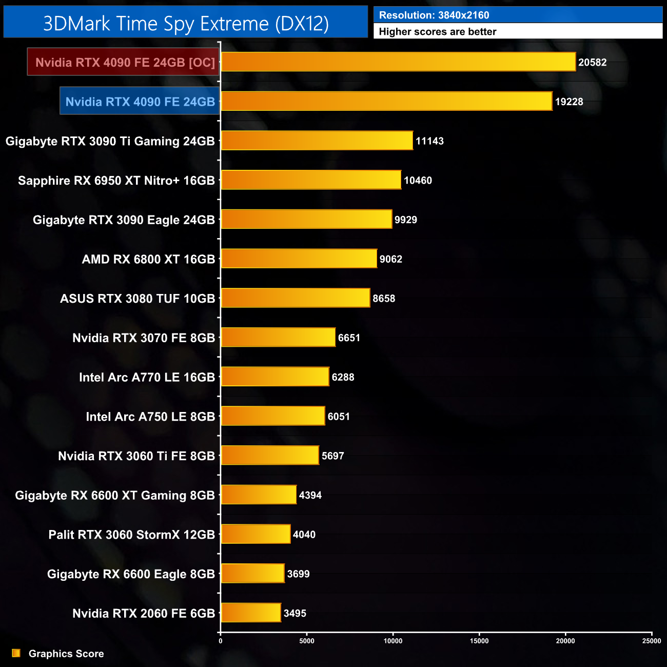 There's a new 3DMark chart topper in town! The RTX 4090 stretches well past the likes of the RX 6950 XT and RTX 3090 Ti, outperforming the latter card by 73% in the Time Spy Extreme benchmark. Hopefully that translates into real-world gaming performance.