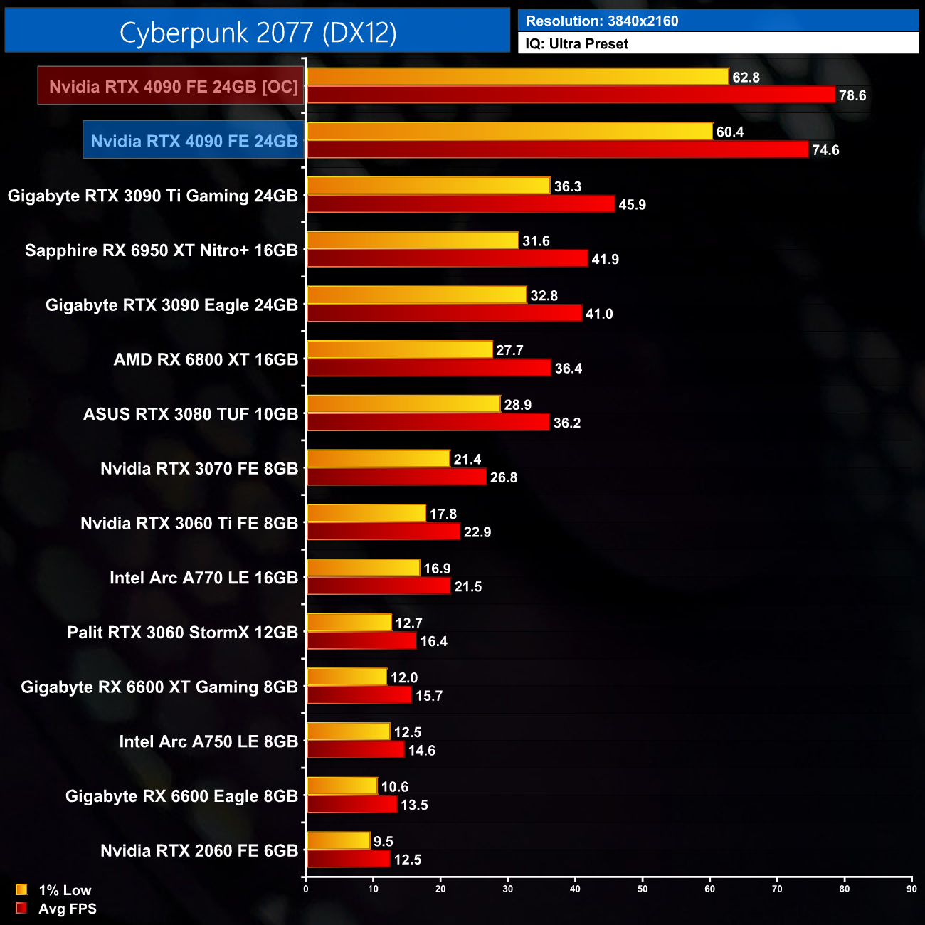 At 4K, where no other GPU can offer a playable experience, the RTX 4090 is able to keep the 1% lows above 30FPS. It's still not a super-smooth experience, but compared to Ampere, this is a huge step forward – we're talking an 82% improvement over the 3090 Ti, and a doubling of performance versus the vanilla RTX 3090.