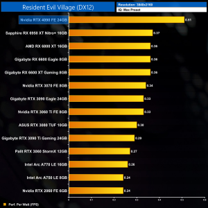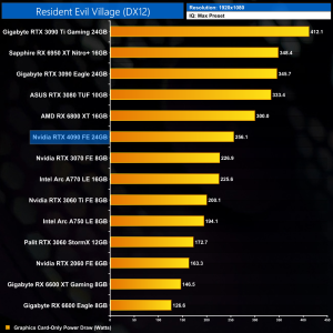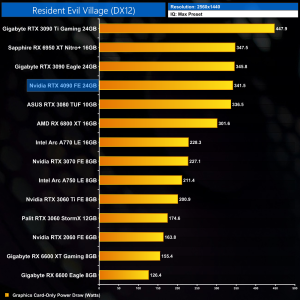 Lastly, we assess Resident Evil Village. Not as intense with its ray tracing features, the RTX 4090 still scales fairly well at 1440p – it's 50% faster than the RTX 3090 Ti, when it was 40% faster with RT turned off.