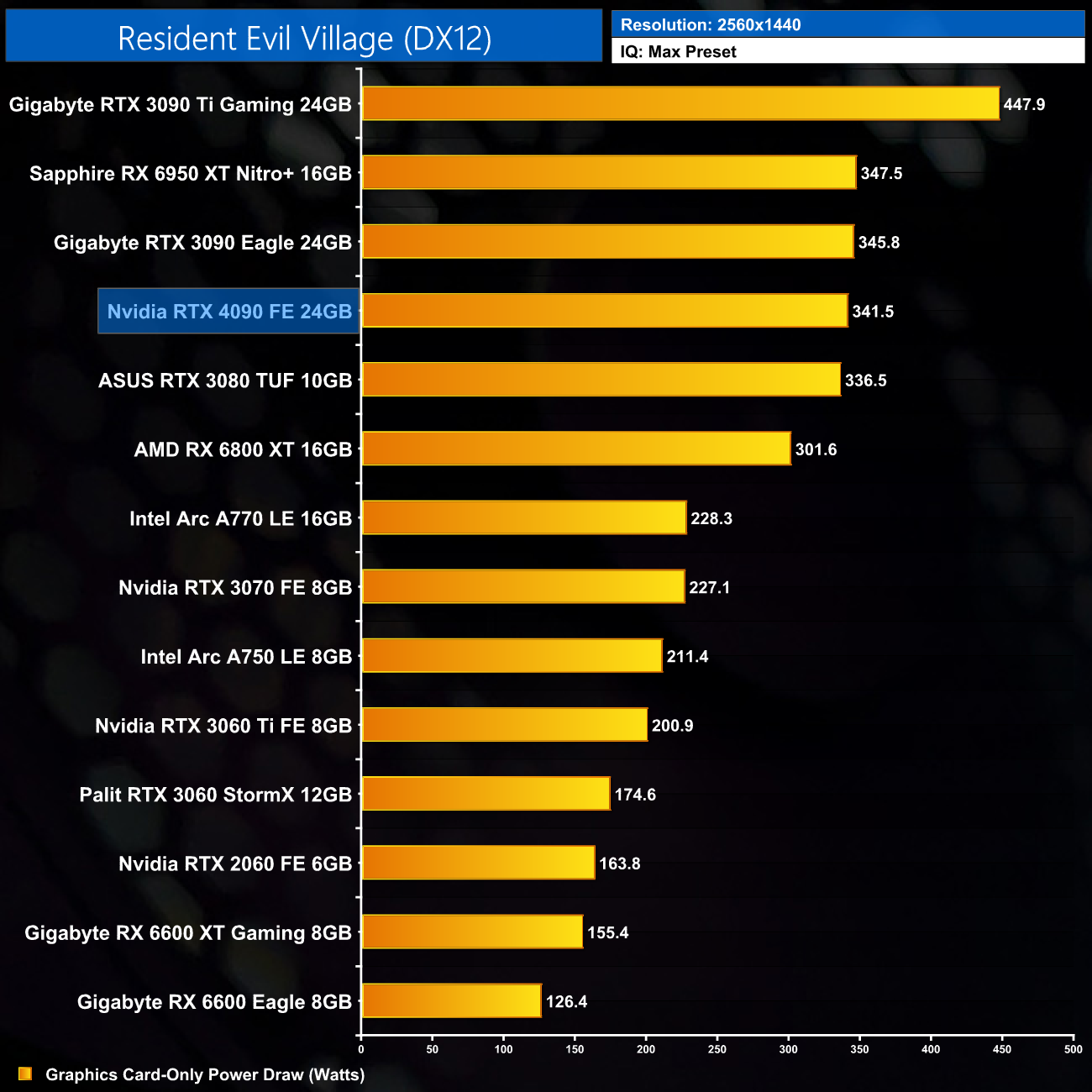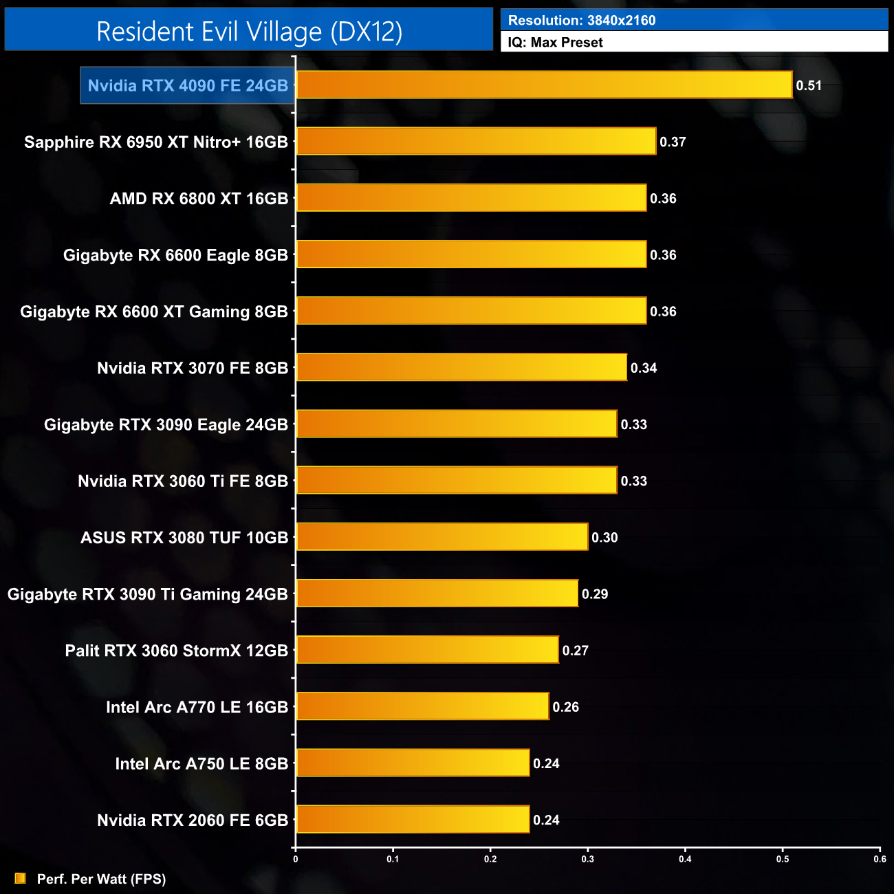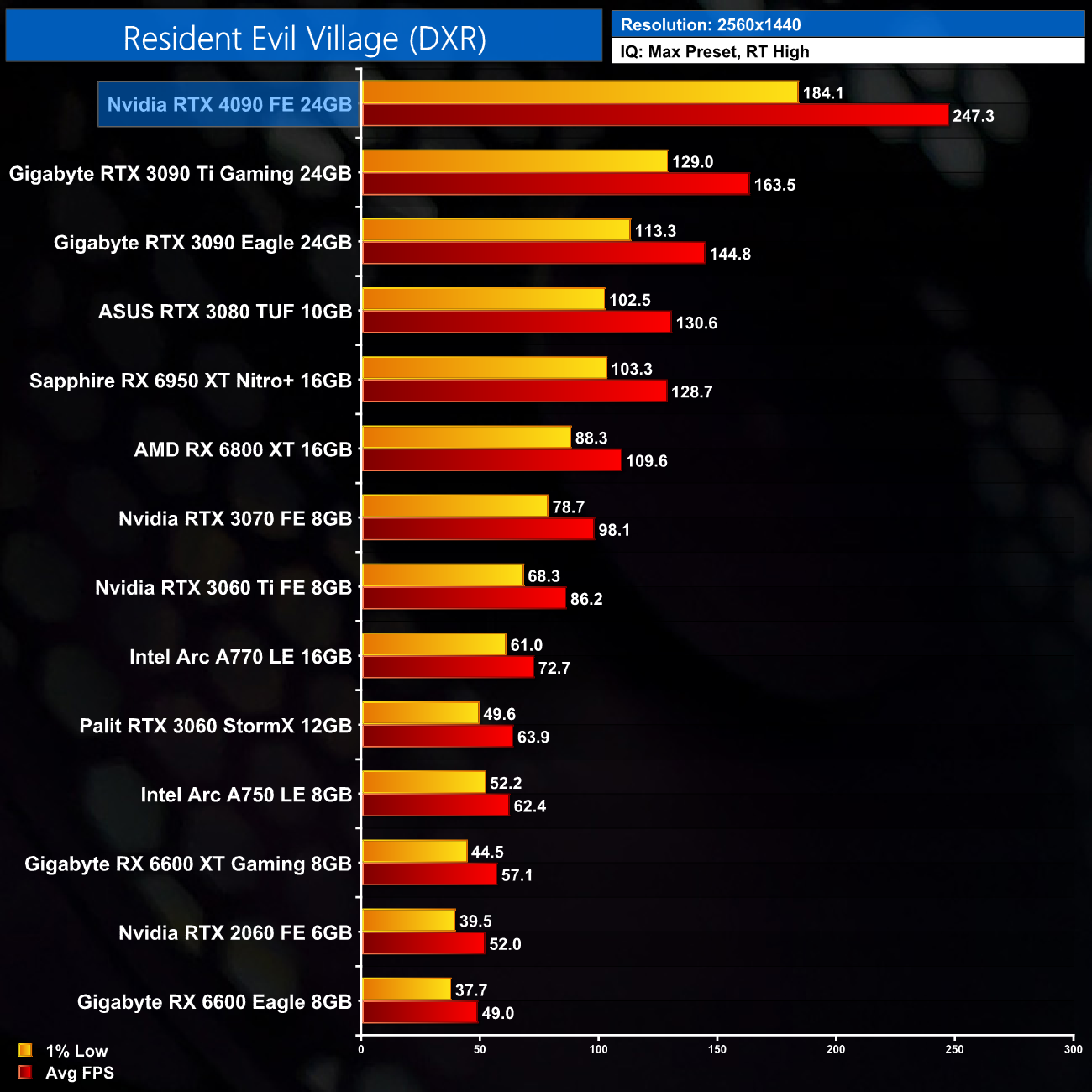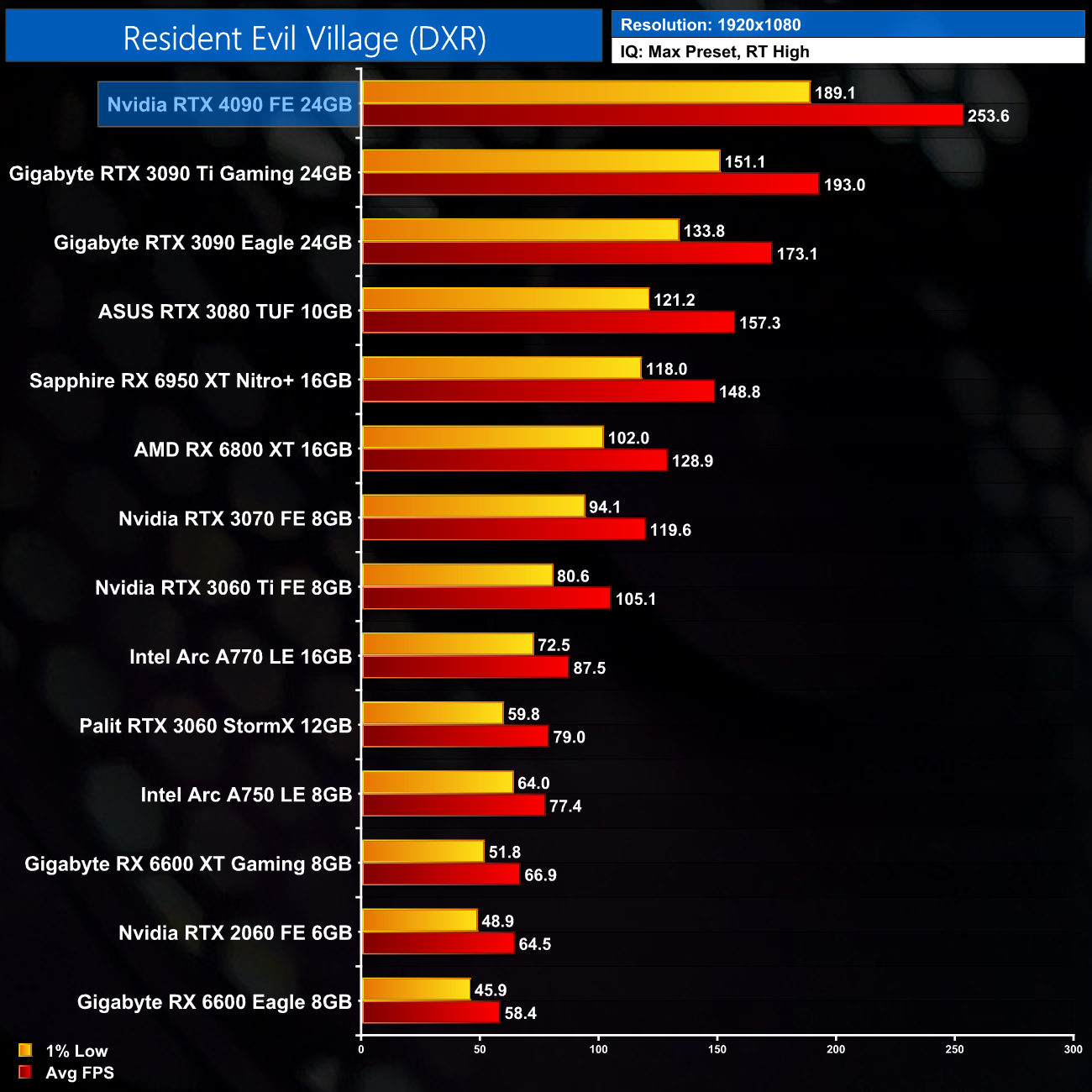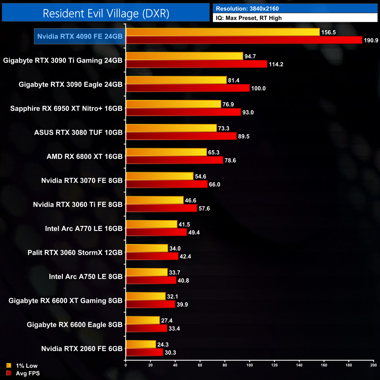 Here we test Resident Evil Village, this time testing with the in-game ray tracing effects set to High.