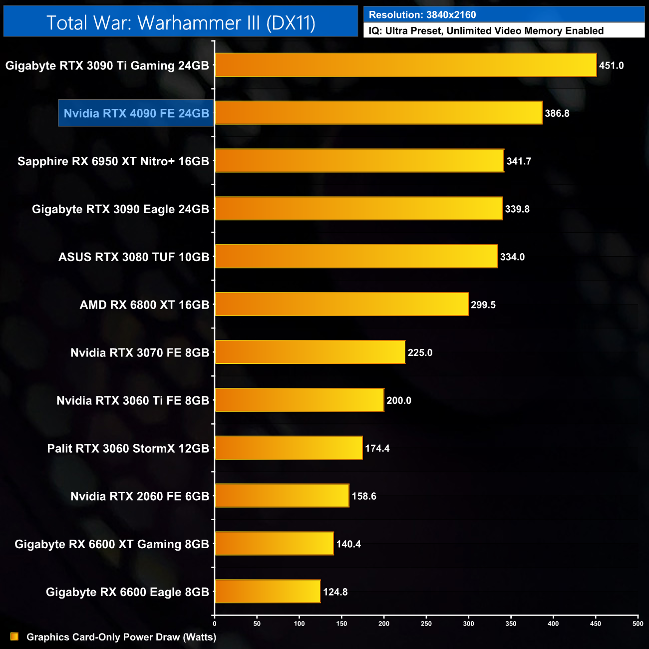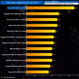 Our last game of the day brings us to Total War: Warhammer III. This is a decent title for the 4090, where it delivers a 54% performance uplift over the 3090 Ti at 1440p.