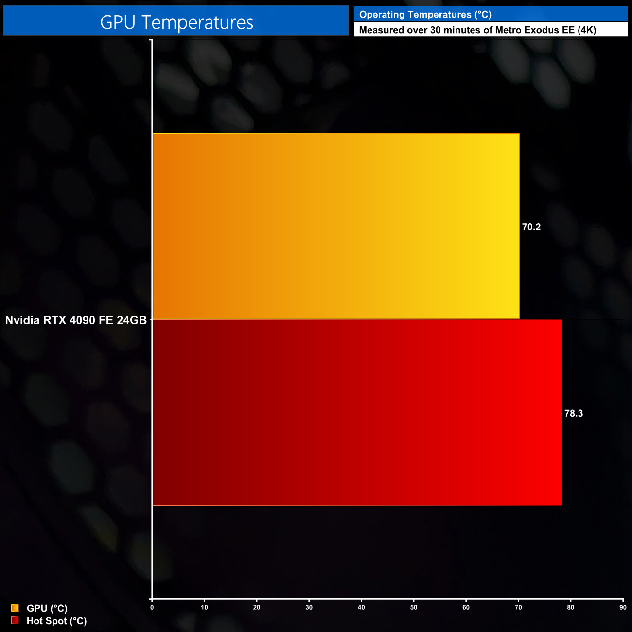 For our temperature testing, we measure the peak GPU core temperature under load. A reading under load comes from running Metro Exodus Enhanced Edition for 30 minutes.