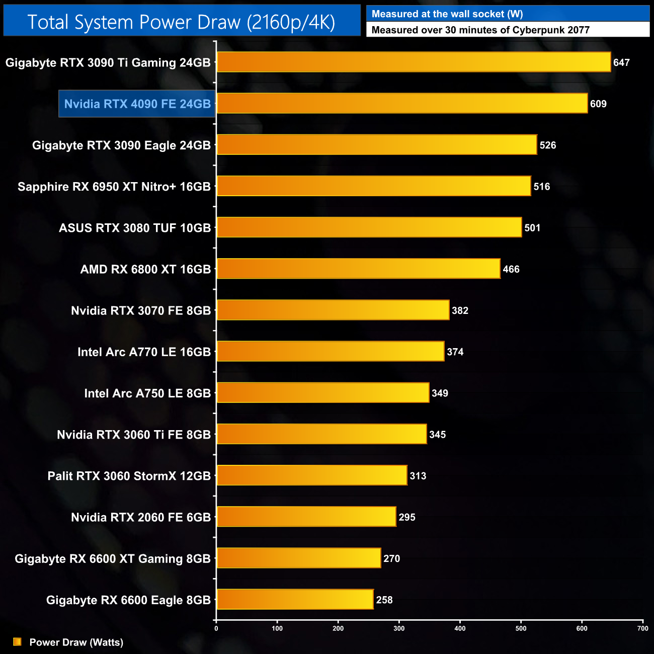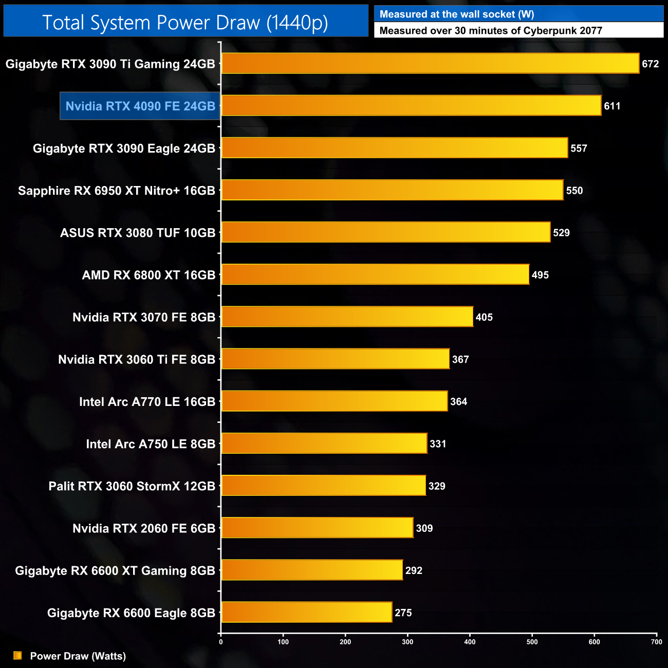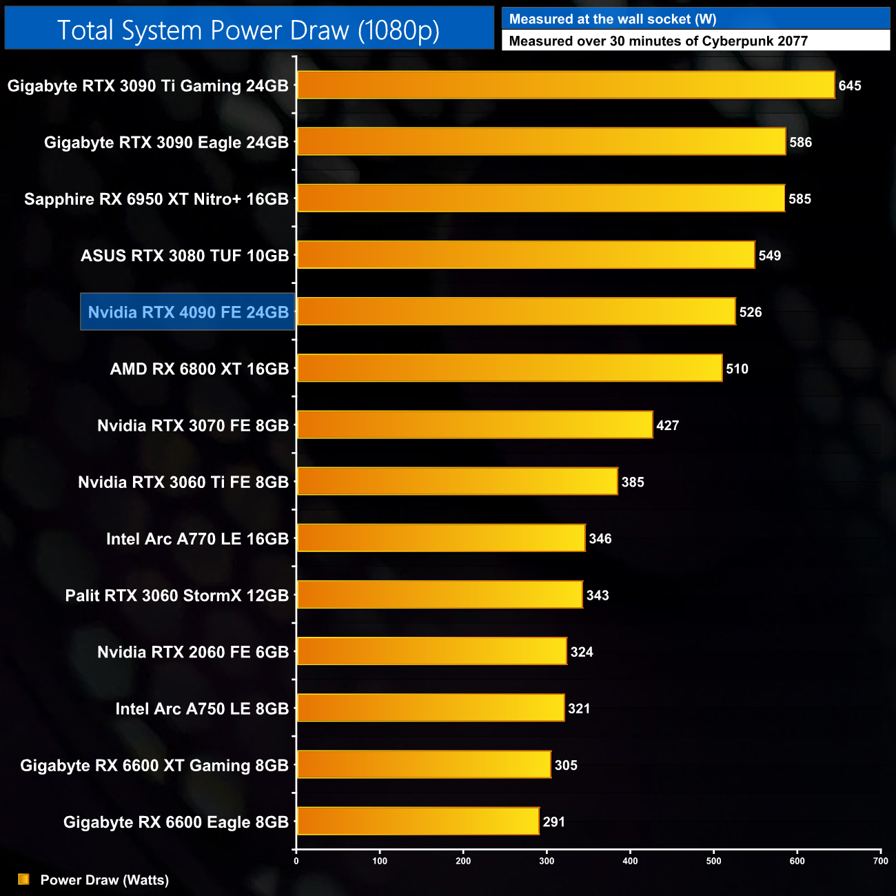 We measure system-wide power draw from the wall while running Cyberpunk 2077 for 30 minutes. We do this at 1080p, 1440p and 2160p (4K) to give you a better idea of total system power draw across a range of resolutions, where CPU power is typically higher at the lower resolutions.