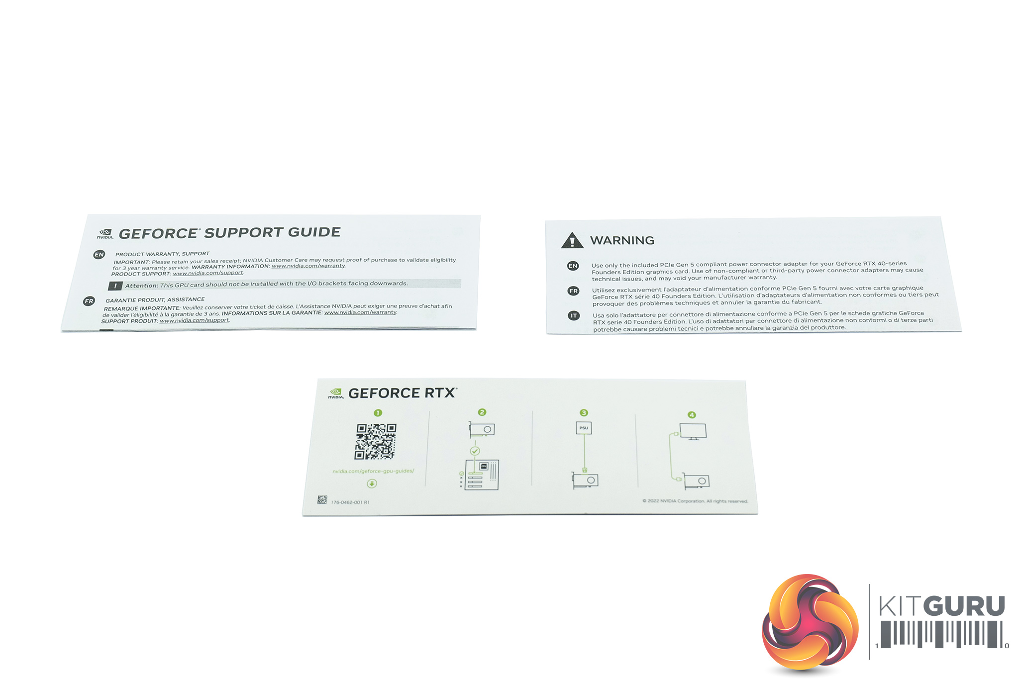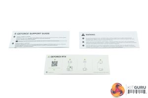 Inside, a quick-start guide and power supply notes are included, as well as the 4x 8-pin to 12VHPWR adapter.