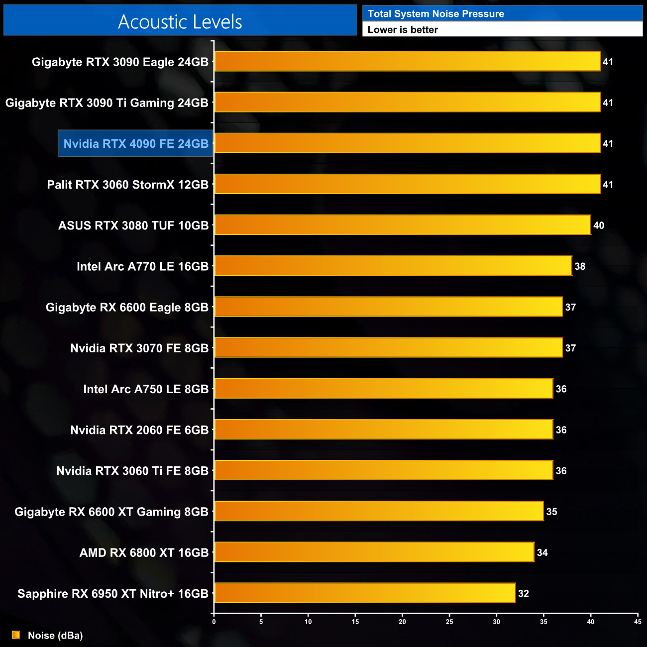 Reducing fan speed by 2% on each fan saw our 4090 hit 40dBa, with temperatures increasing by a couple of degrees for both the GPU and hot spot. Again, we've no comparisons for this data just yet, but we will do shortly when we are able to test a range of AIB cards.