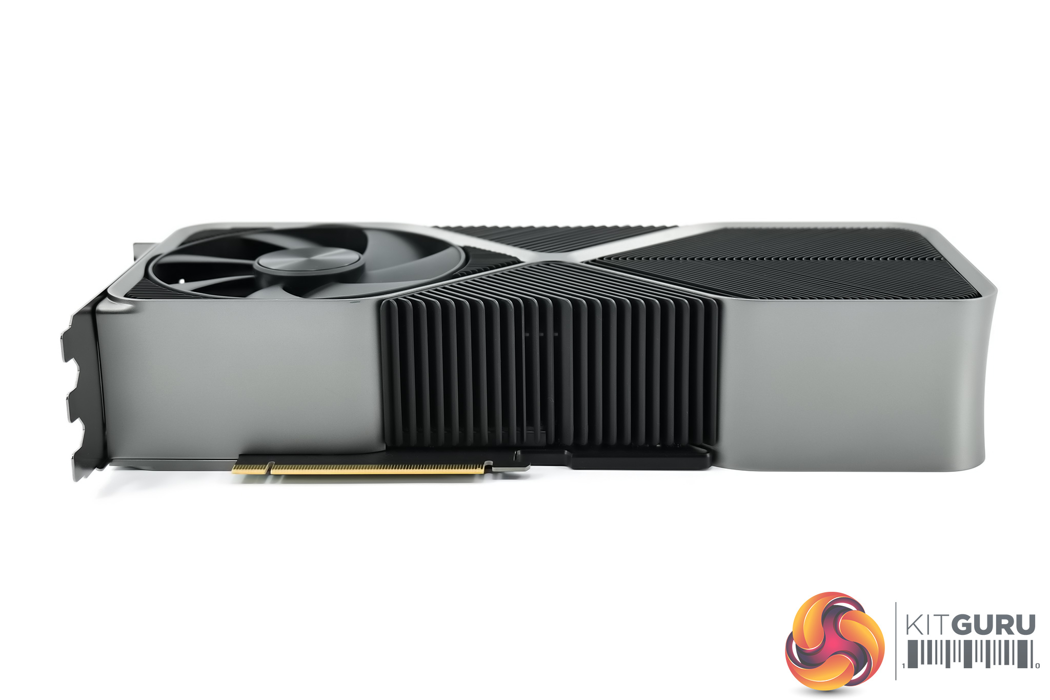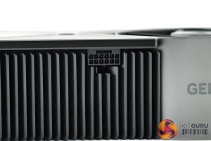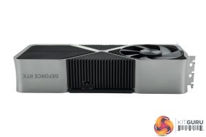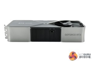 The side of the card is fairly plain, with the grey metal frame on show, along with some large aluminium heatsink fins. The GeForce RTX branding is also present here in its new font, and this is illuminated by white LEDs once powered on.