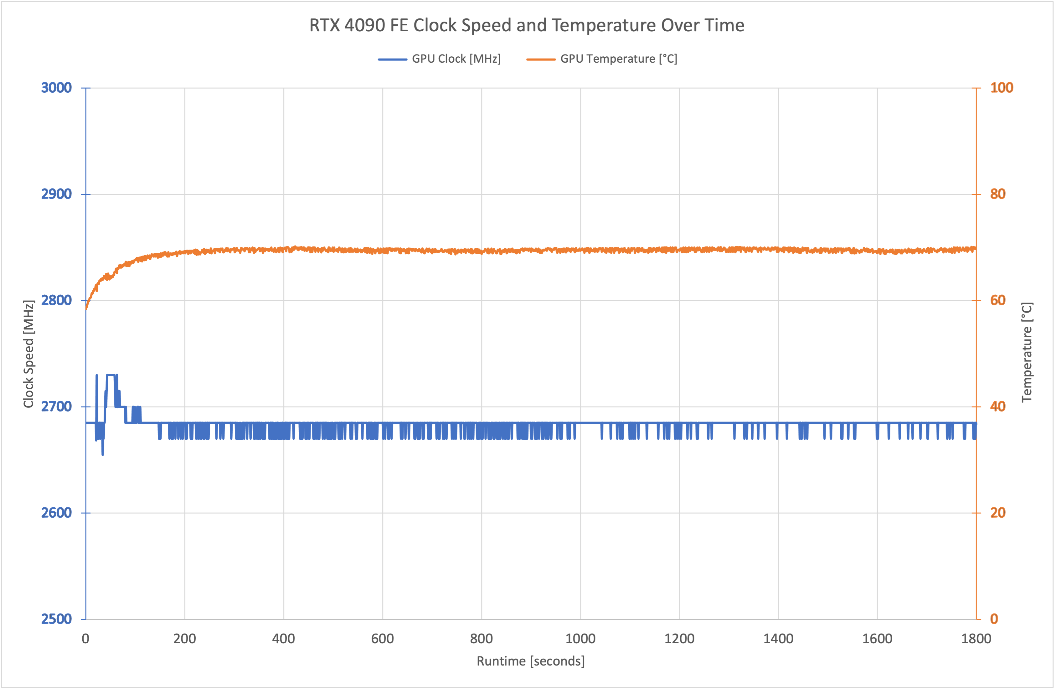 We're only able to share data for the RTX 4090 Founders Edition in this review so a bar chart is not particularly useful. Instead, check out the above scatter graph for a real-time plot of the card's operating clock speed and temperature. Over the 30-minute run, the Founders Edition averaged 2683MHz, boosting up initially to 2730MHz before settling down just below the 2.7GHz figure.