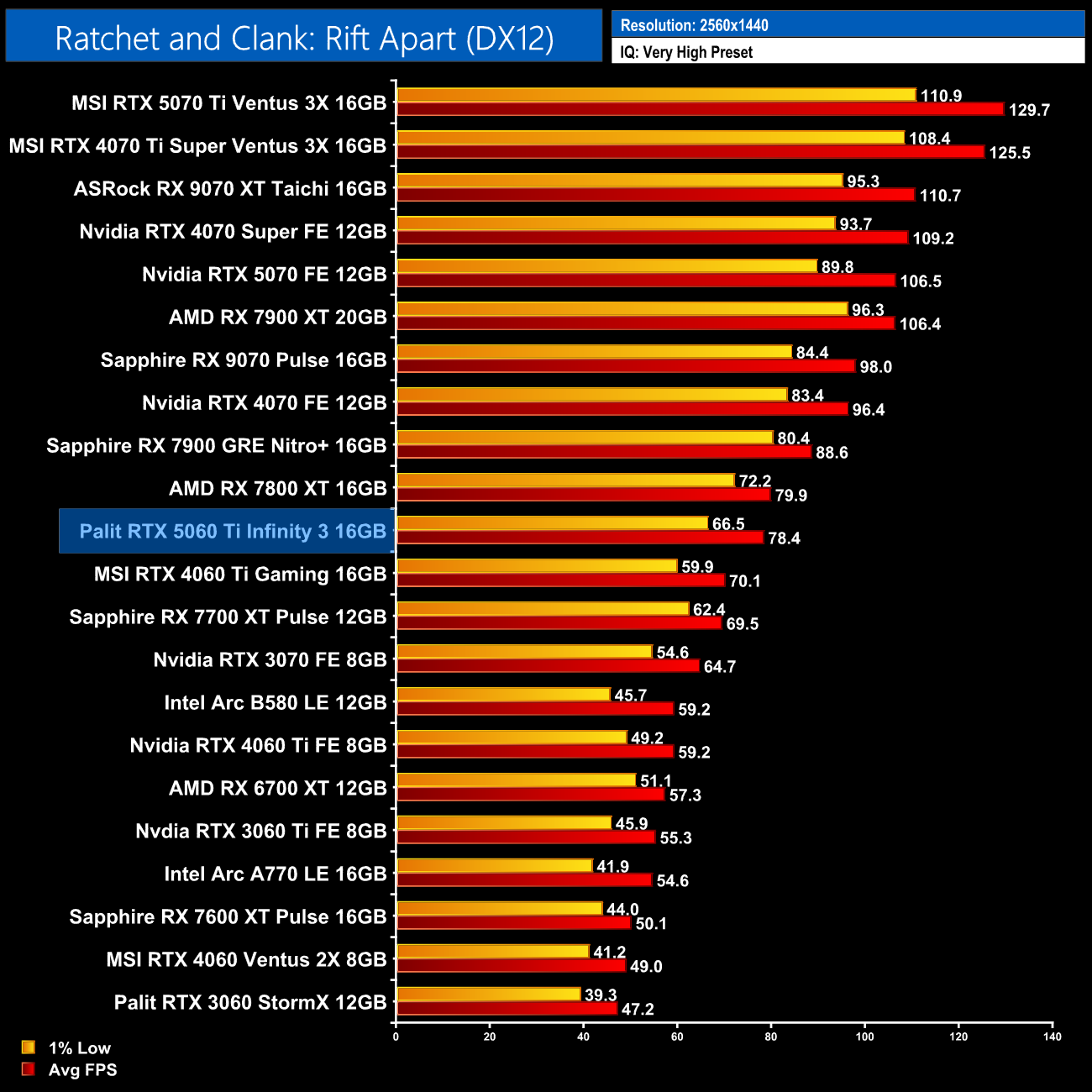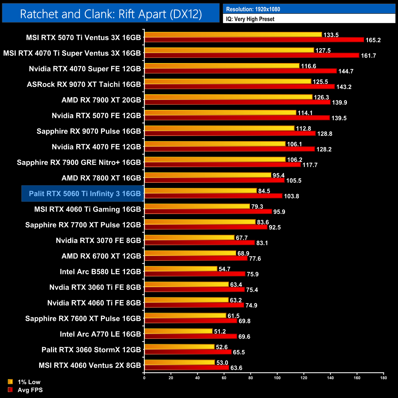Ratchet and Clank is another title where the 5060 Ti 16GB and 7800 XT go head to head, the average frame rates are very similar but AMD does have a slight advantage for the 1% lows at 1080p.