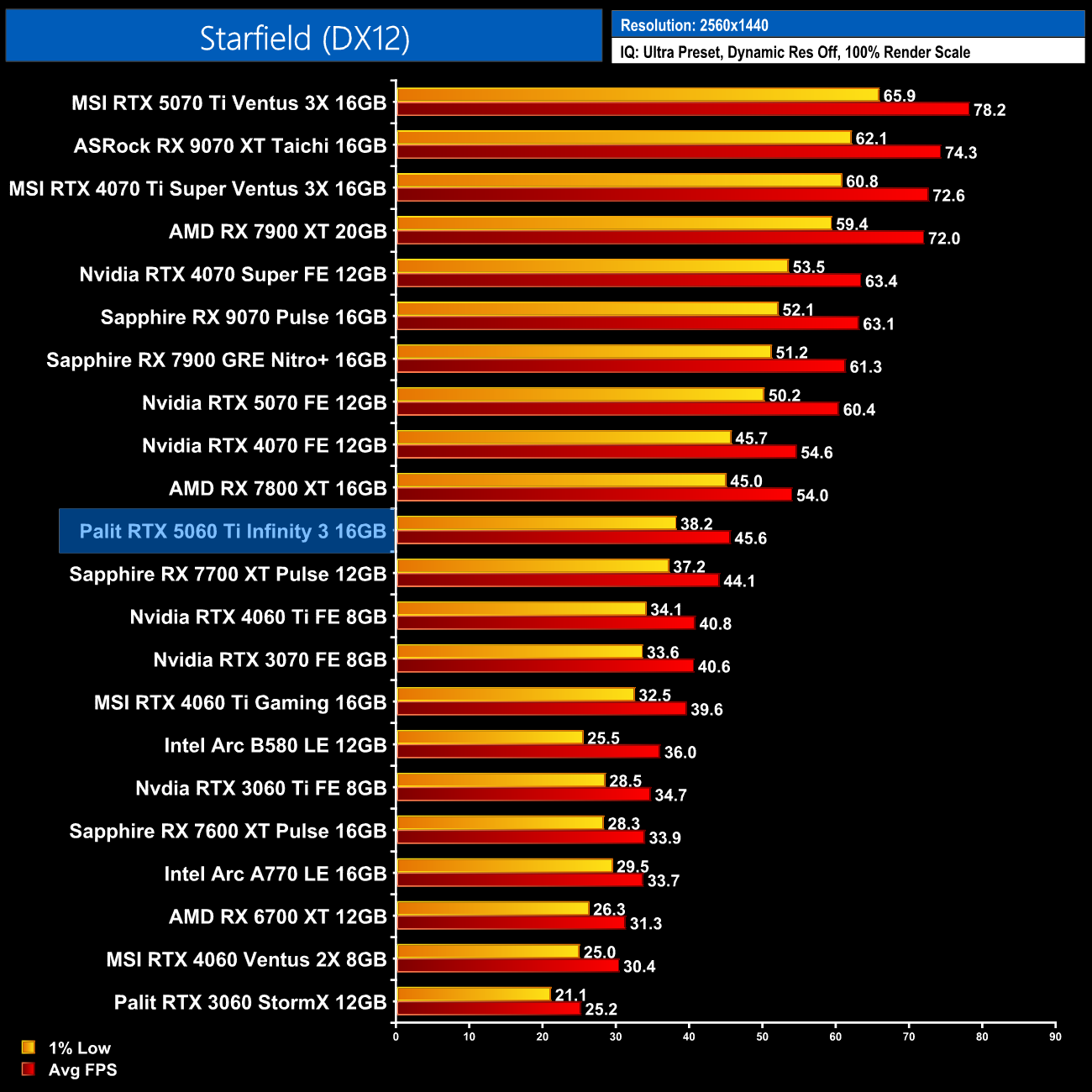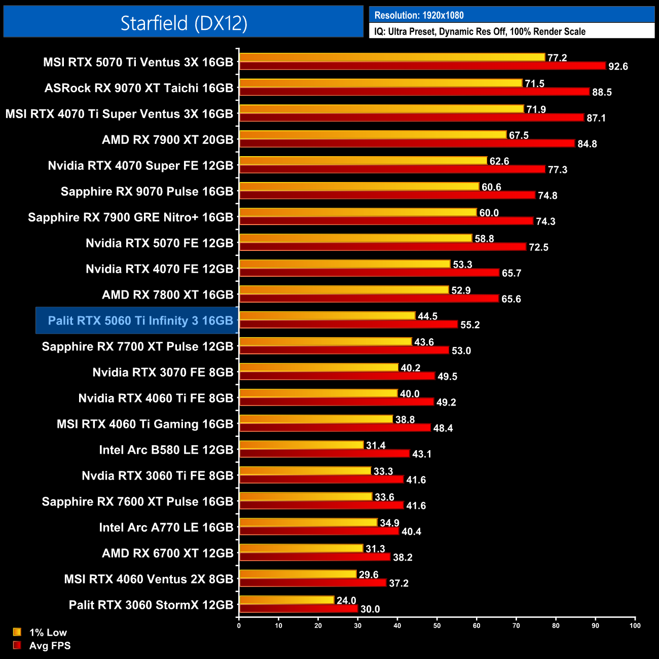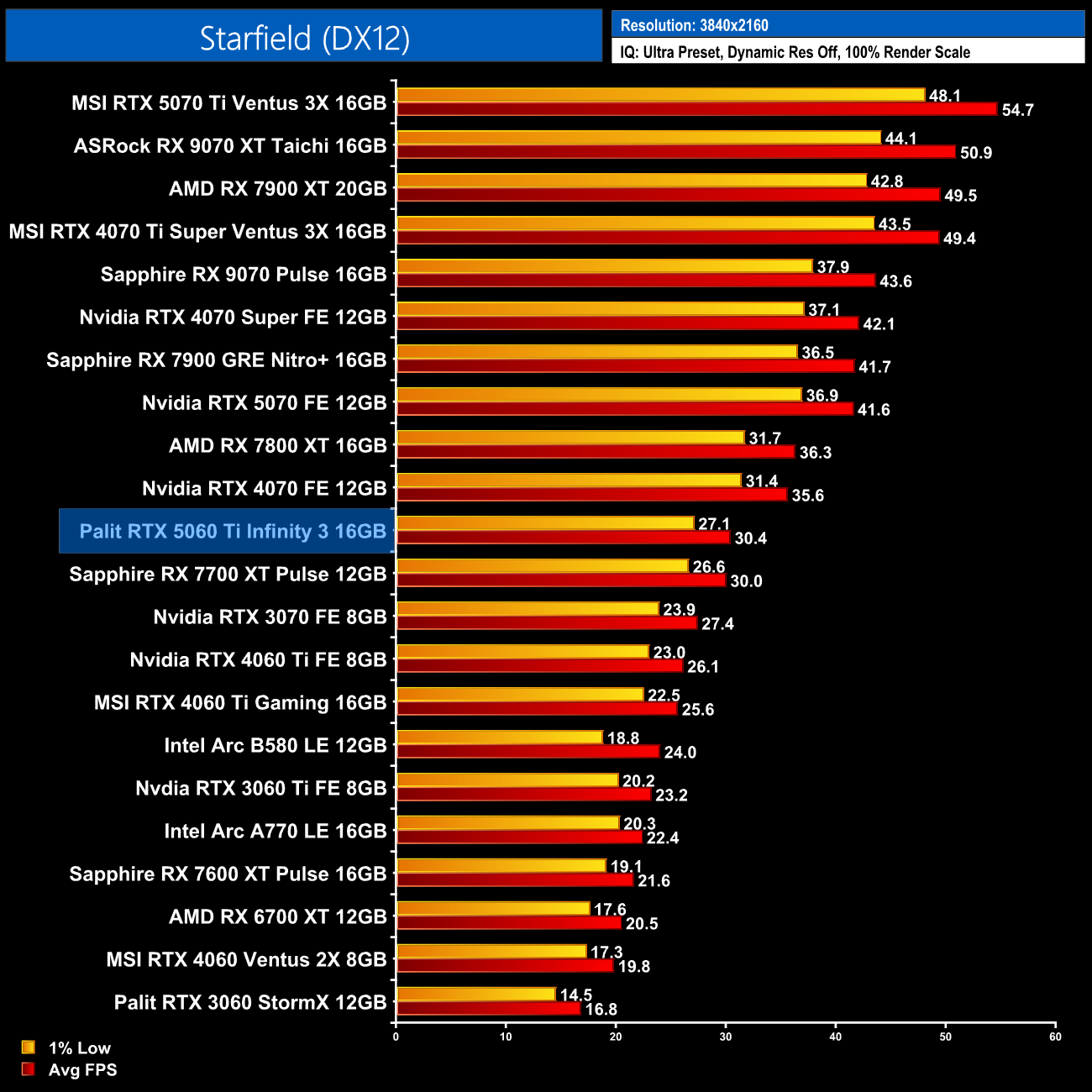 Lastly, we come to Starfield, with the 5060 Ti 16GB sitting alongside the 7700 XT on 55fps average, making it 16% slower than the RX 7800 XT.