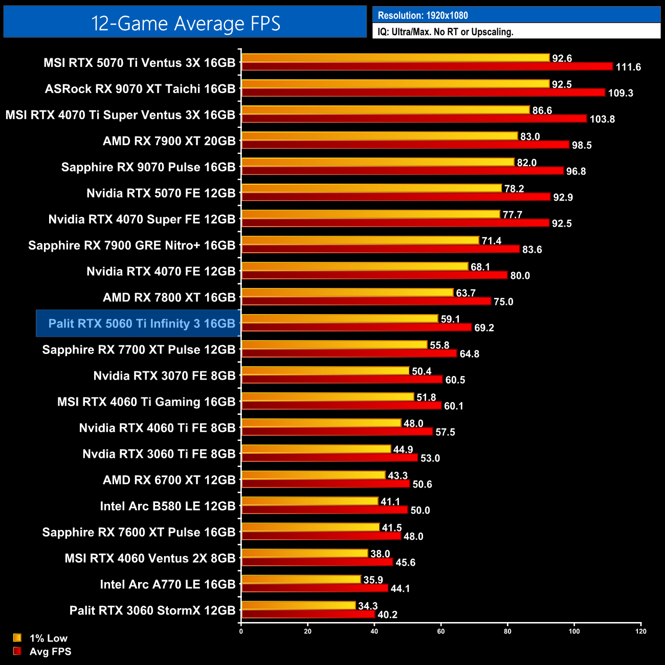 Over the twelve games tested, the RTX 5060 Ti 16GB sits neatly between the RX 7700 XT and 7800 XT at 1080p, given it's 7% faster than the former but 8% slower than the latter. We're looking at a 15% uplift over the RTX 4060 Ti 16GB, which isn't amazing but also isn't bad in the context of the 50 series. Gains over the RTX 3060 Ti however, average out at just 31% which doesn't sound like much progress given that GPU launched back in late 2020.