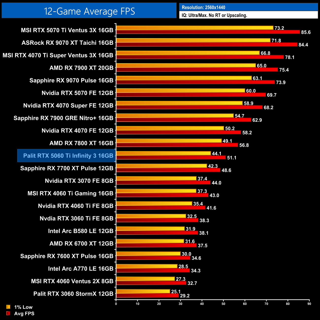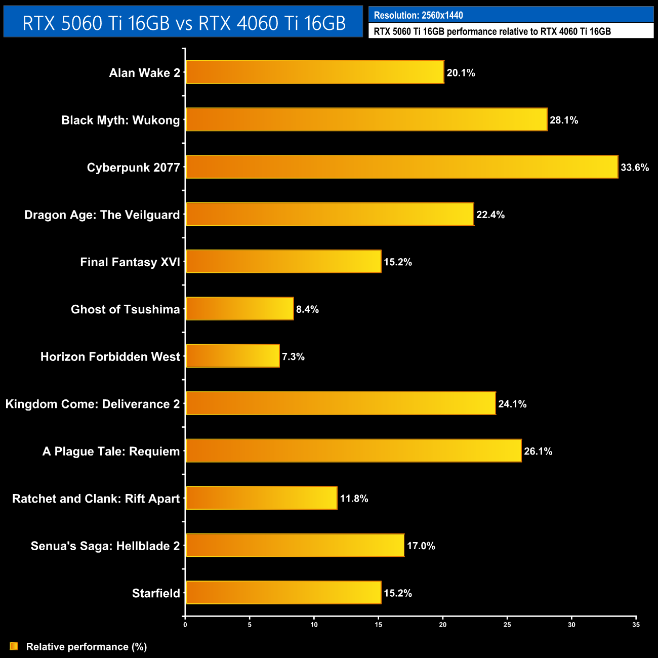 The 5060 Ti 16GB does scale better at 1440p, given the range is now 7-34% over its predecessor.