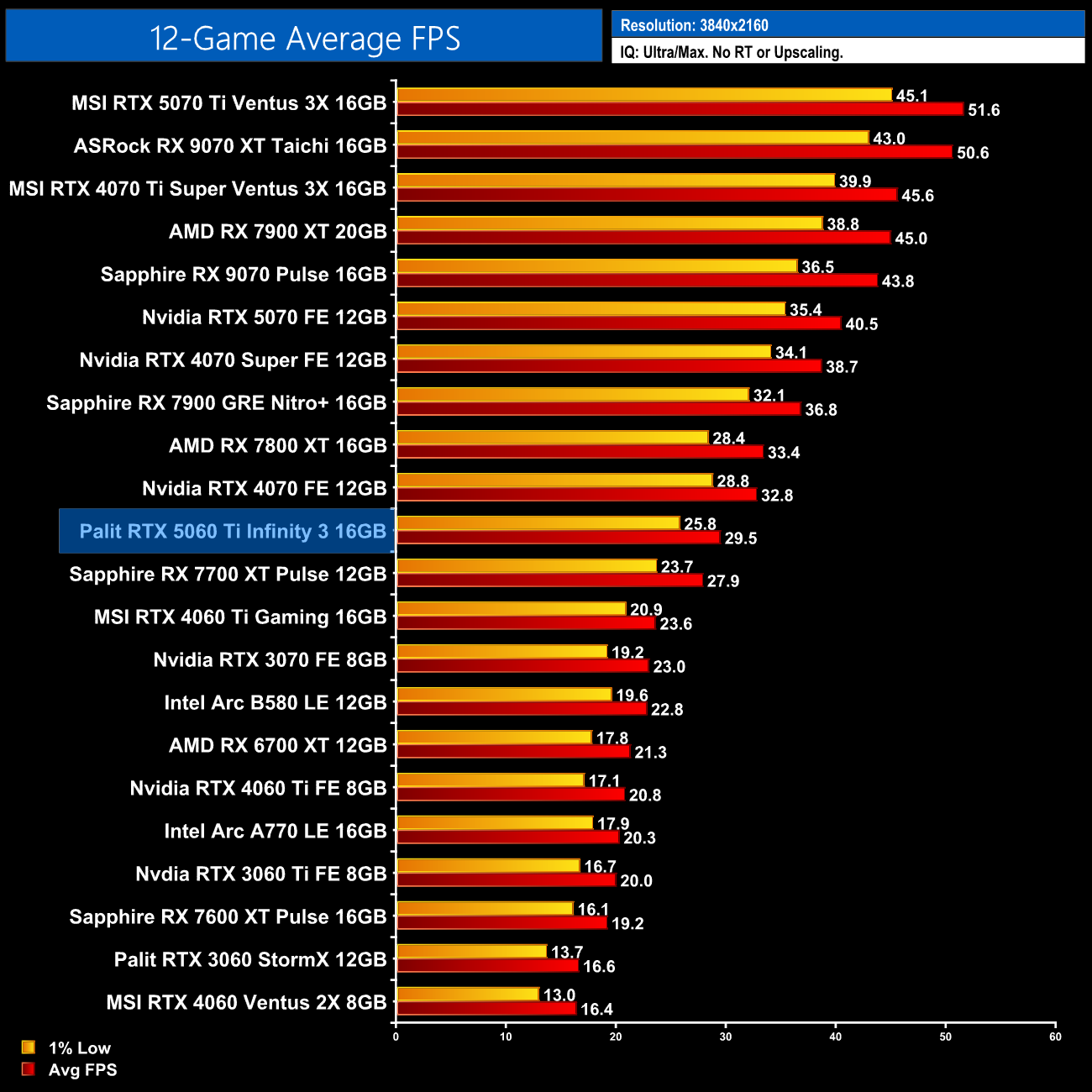 It's also a decent 1440p option, though it does fall away at this resolution in comparison to other GPUs, due to the relatively narrow 128-bit memory interface. Here it's just 5% faster than the 7700 XT and 10% slower than the 7800 XT, though it does now offer 19% better performance than its direct predecessor. Versus the 3060 Ti, we're looking at just a 33% gain.